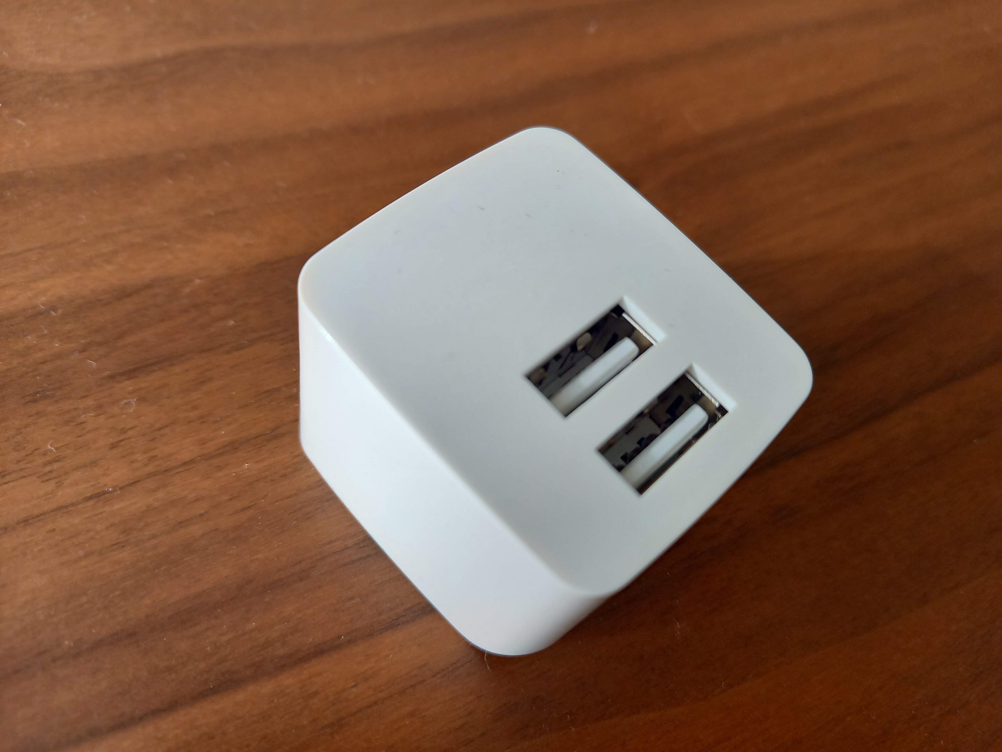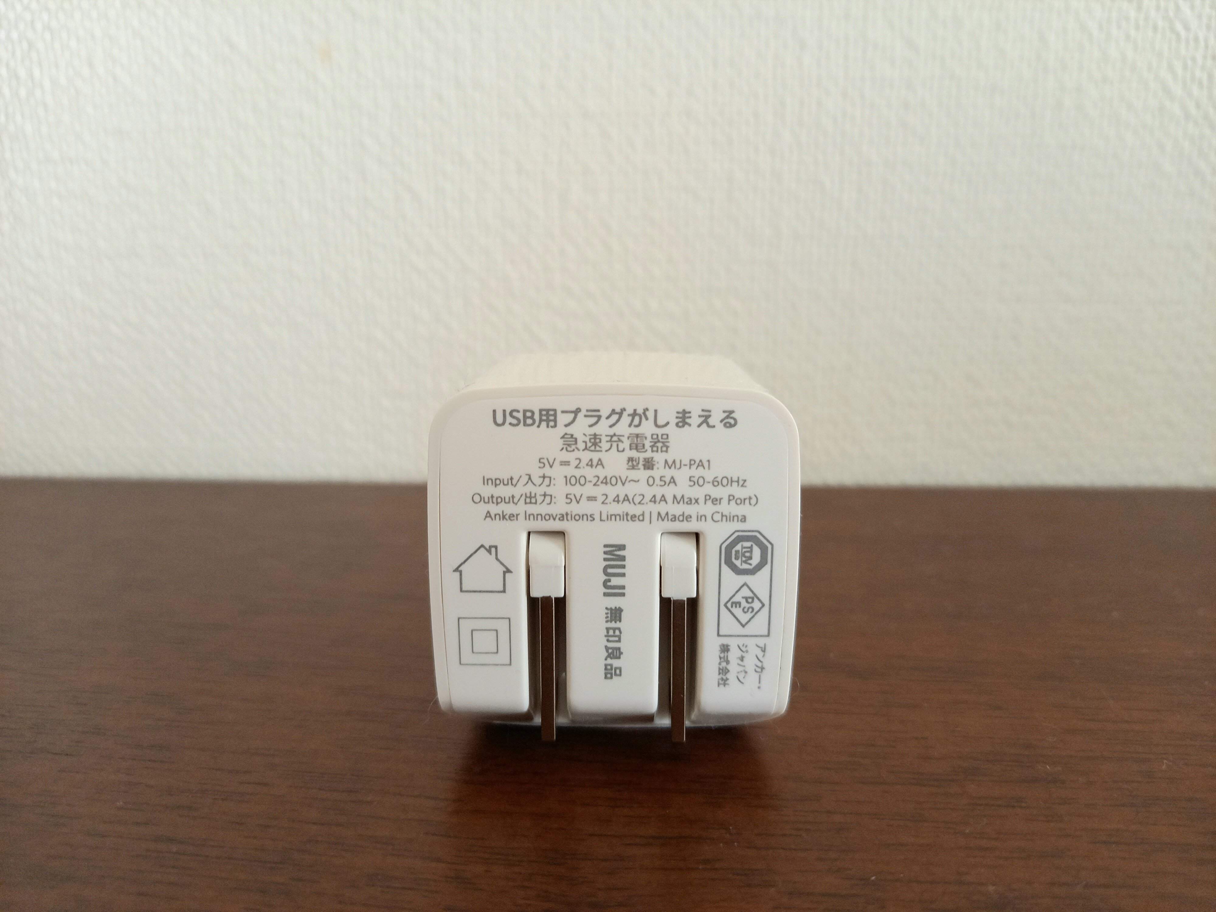 無印らしい真っ白のシンプルなバッテリー充電器。差し込み口が2つついているのもうれしいポイントです。2ポートで合計12Wの出力ができるので、その範囲内であれば2台の端末を同時充電することができますね。出力も、2.4Aの高出力なためすぐに充電できるのがいいですね。この性能で1,290円(税込)というお手ごろ価格なのもうれしいですね。