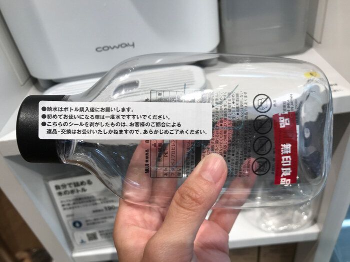 しっかりと未使用のシールが貼ってあり、安心感がありますね。「自分で詰める水のボトル」は回収してもらうこともでき、店舗に返還BOXが設置されています。サイズも小振りで持ち歩きにとても便利です。