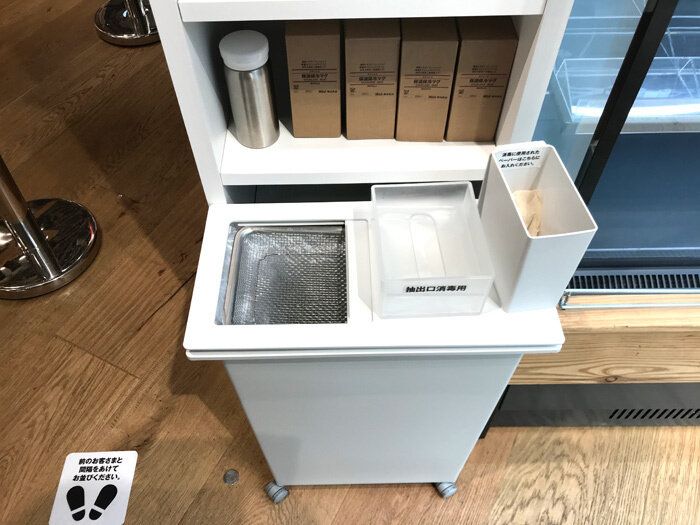 給水場の近くには水を捨てるエリアがある店舗も。ささっとすすいで、入れ直すことも可能ですね。画像は銀座店ですが、給水口を消毒するペーバーなどもあり、かゆいところに手が届いているなあ〜!という思いにかられました。