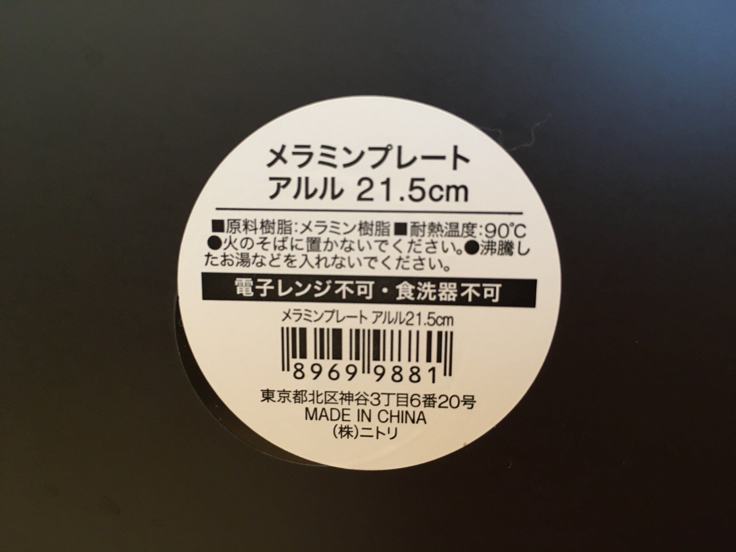 サイズは26.5cmと21.5cmの2サイズ展開。我が家では21.5cmを使用しています。こちらは底面に貼ってあるシールなのですが、ご覧のとおり「電子レンジ不可・食洗器不可」なんです……食器としてはちょっと気を遣わないといけないのが玉にキズ。でも逆に「食器以外」としての用途なら、まったく問題なし!こんなにオシャレなメラミンプレート、なかなかないかも?
