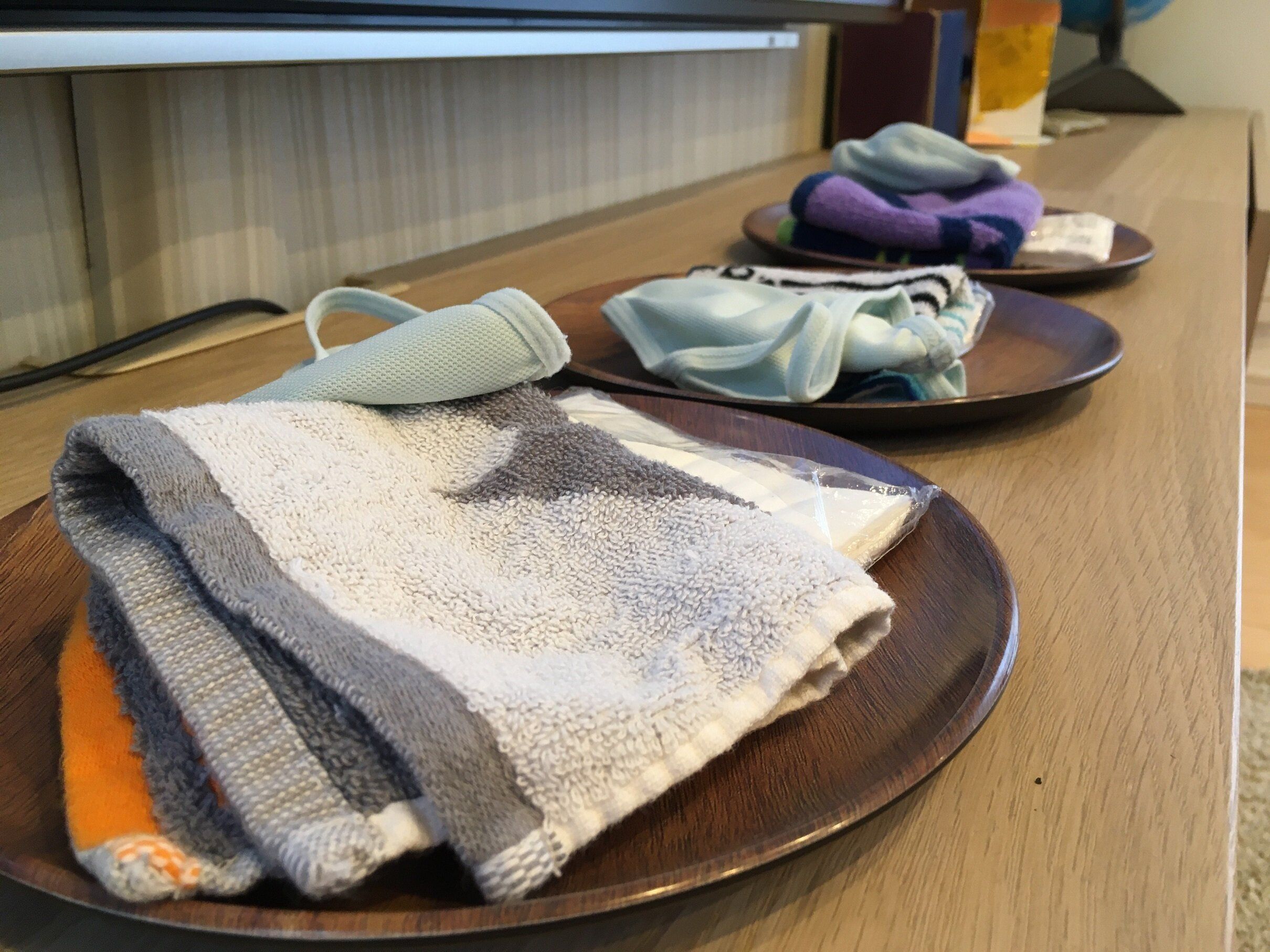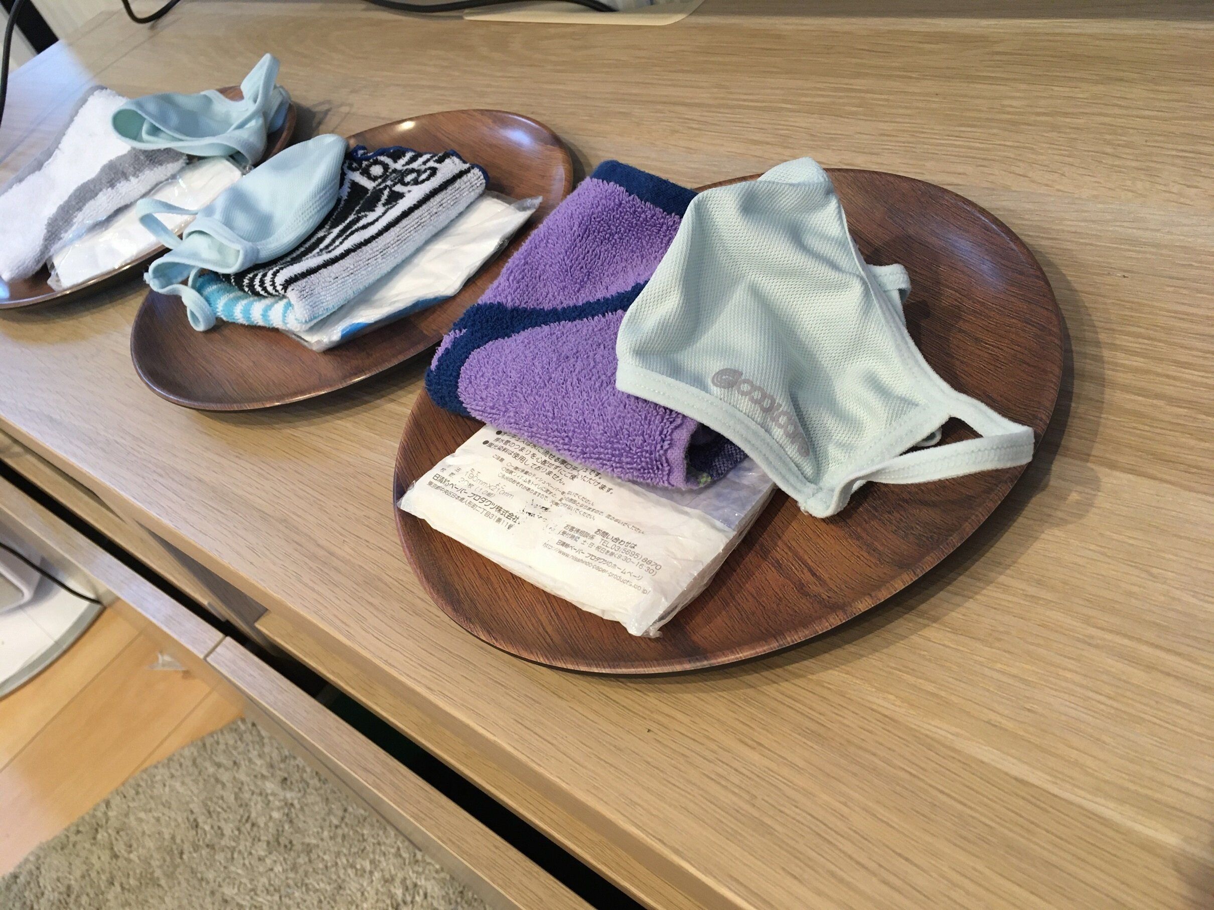 写真はリビングにあるTVボードの上を写したもの。このようにメラミンプレートを並べ、前日の夜各自で「ハンカチ・ティッシュ・マスク」の3点セットを準備。寝るときにここが空っぽなら、一言伝えて準備してもらえばOK。
