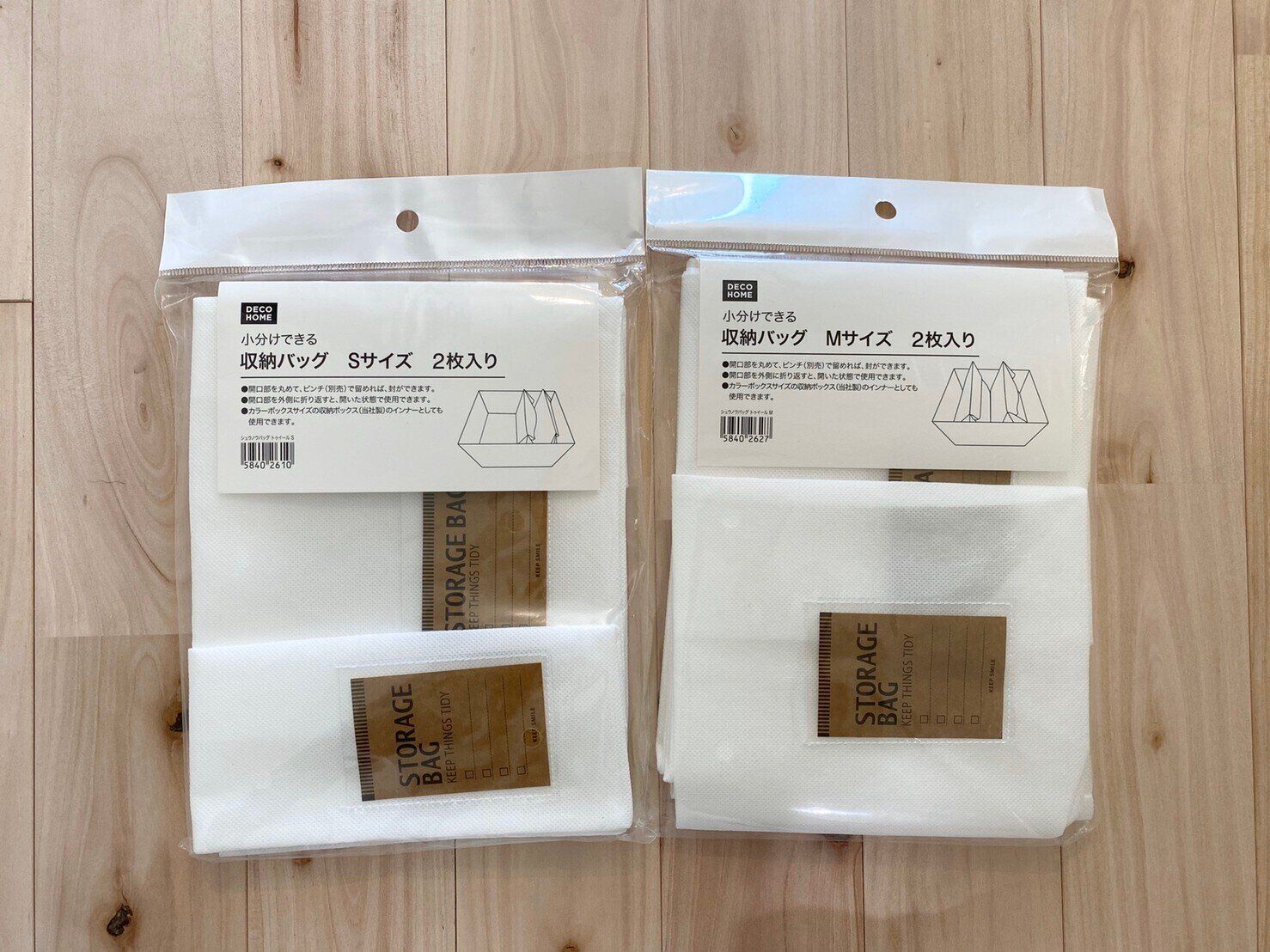 今回ご紹介するのは、ニトリ デコホームで購入した「小分けできる収納バッグ」。SサイズとMサイズがあり、どちらも1商品につき2枚入り。価格はSサイズが363円、Mサイズが454円です。