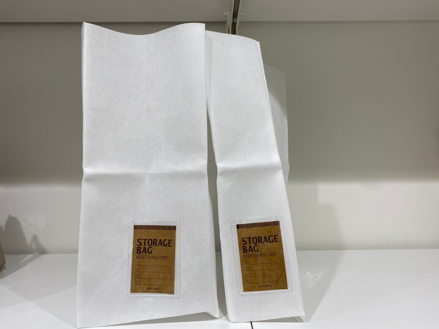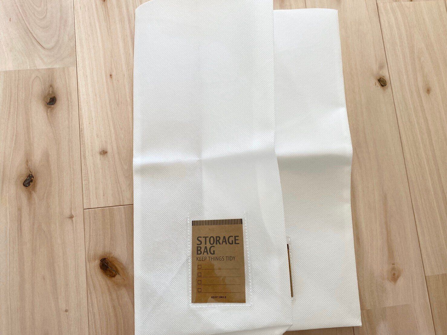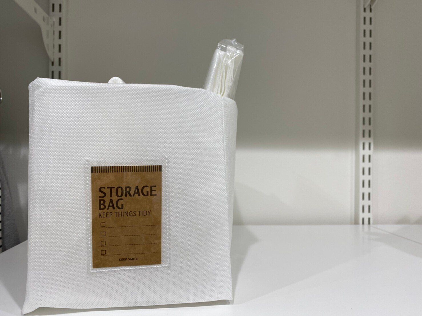 この収納バッグのポイントは、写真の「STORAGEBAG」と書かれた紙タグが入っているポケットつきというところと、マチがあるところ!白いバッグに茶色のタグがオシャレですね。