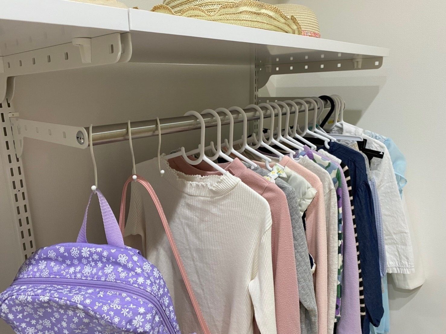服のサイズに合わない小さな(ベビー服の時に使っていたものとか)ハンガーをいつまでも使っていると、ハンガーから服がずり落ちたり、逆に大人用のハンガーなどを使っていると自分では服を外しにくくなったりします。お子さんご自身が自分で管理しやすい仕組みが大切です。