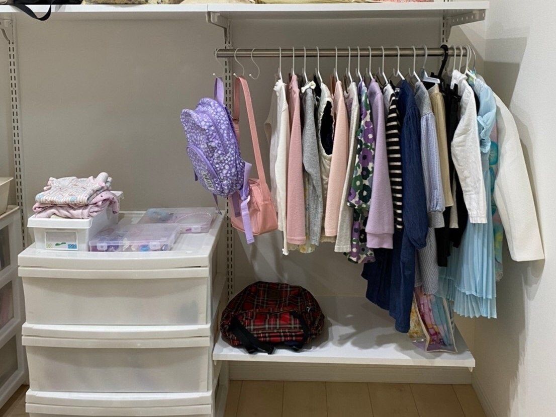 小学生になると着替えを持ち運ぶ頻度もグンとさがり、服のサイズも大きくなるので、たたむ収納より吊るす収納がおススメです。