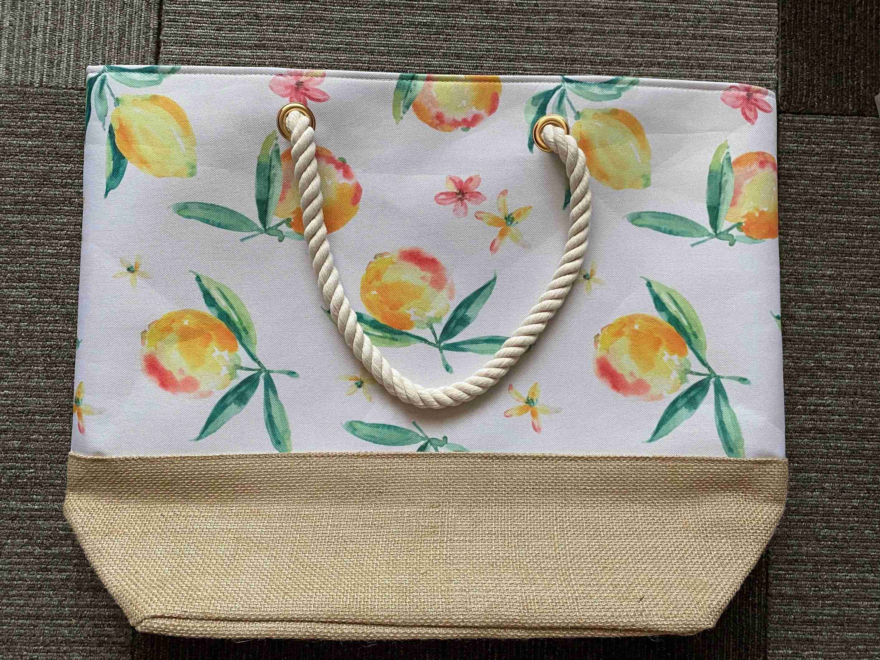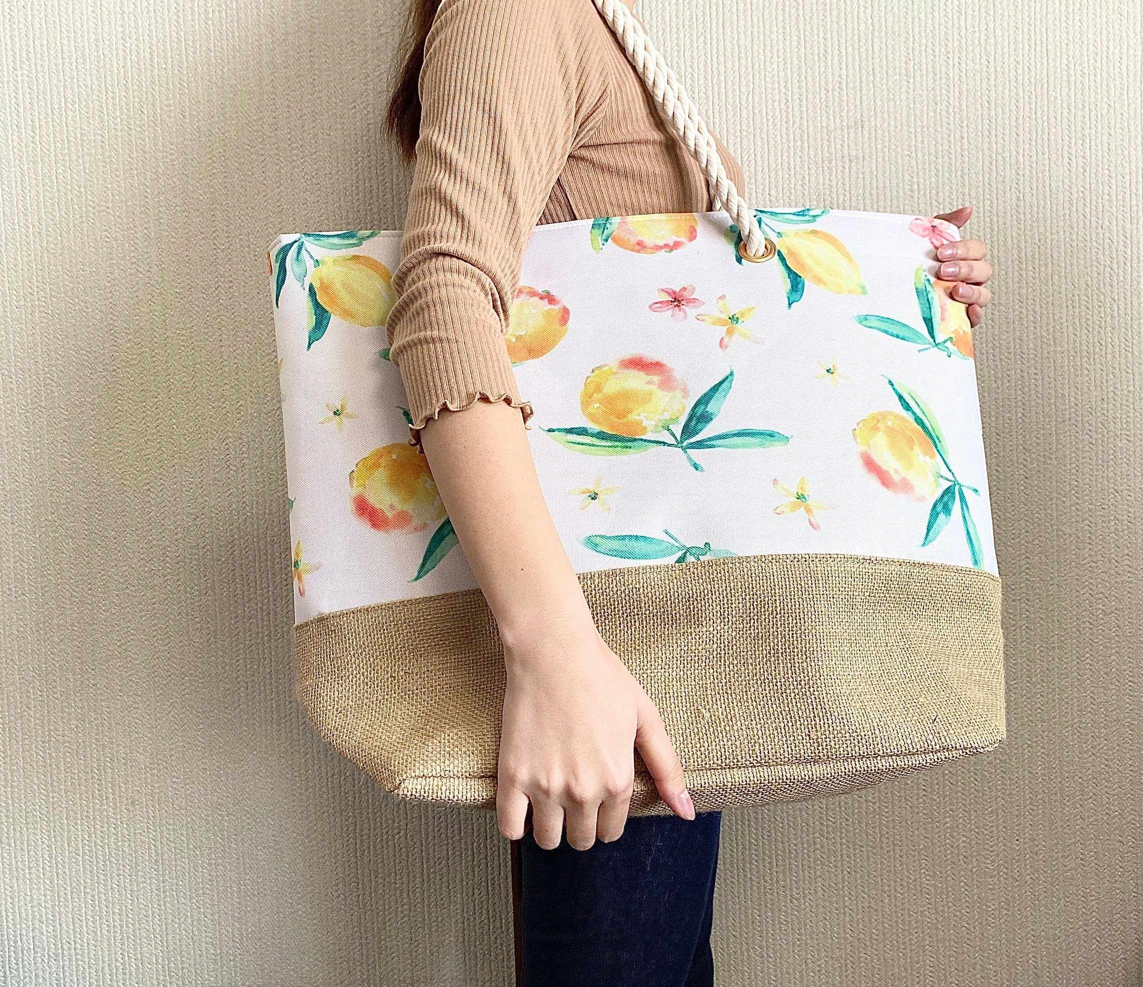 今回ご紹介するのは、ニトリの「ロープバッグ」。ライトグレー、ブラック、イエロー、ゴールド、シルバー、ピーチの6色展開で、それぞれカラーだけでなくデザインも異なっています。価格は各1,355円。今回筆者はフルーツ柄が目を惹く「イエロー」をチョイスしました。