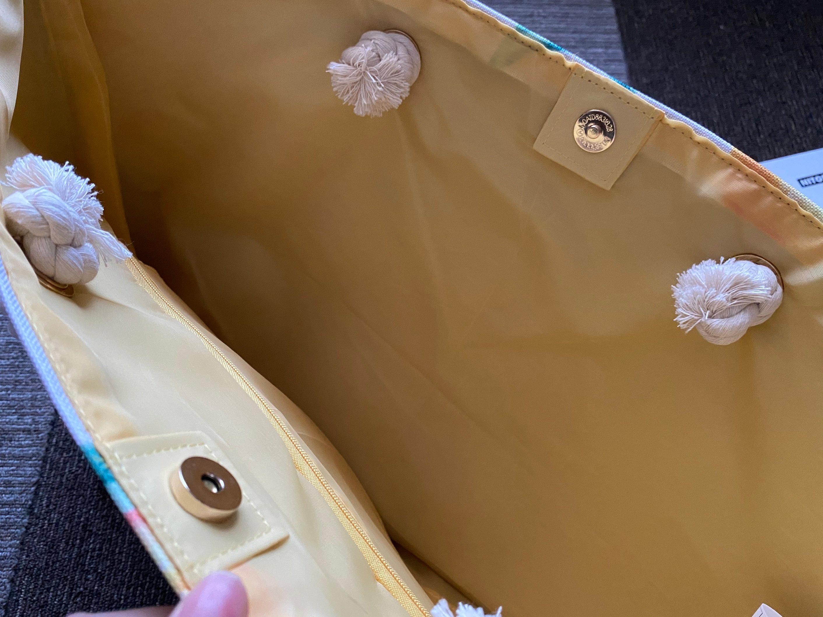 バッグのサイズは幅54×奥行15×高さ38cm。大きめだけど軽くて、持ちやすいロープが春夏の利用にピッタリ!入れ口はマグネットで閉まるし、内側にはしっかりポケットもあります。