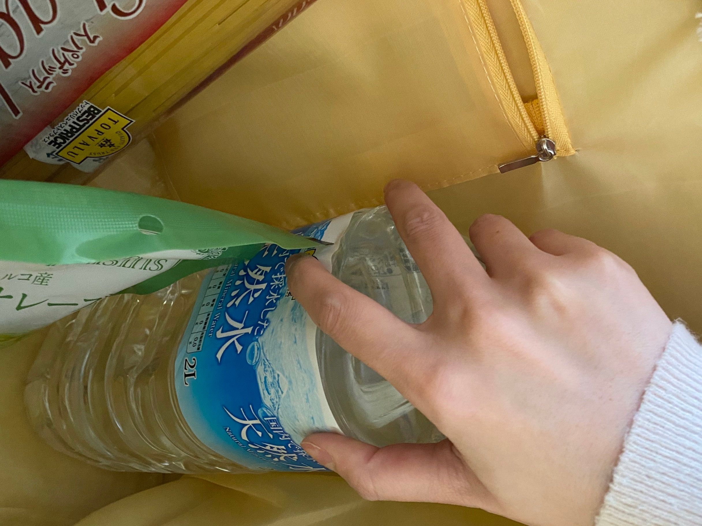 このバッグ、マチがたっぷりあるので、とにかくたくさんの荷物が入ります。2Lのペットボトルも写真のとおりスッポリと収まります。一方で、バッグ自体の重量は約330gと軽め。たくさん入れても使いやすいですね。