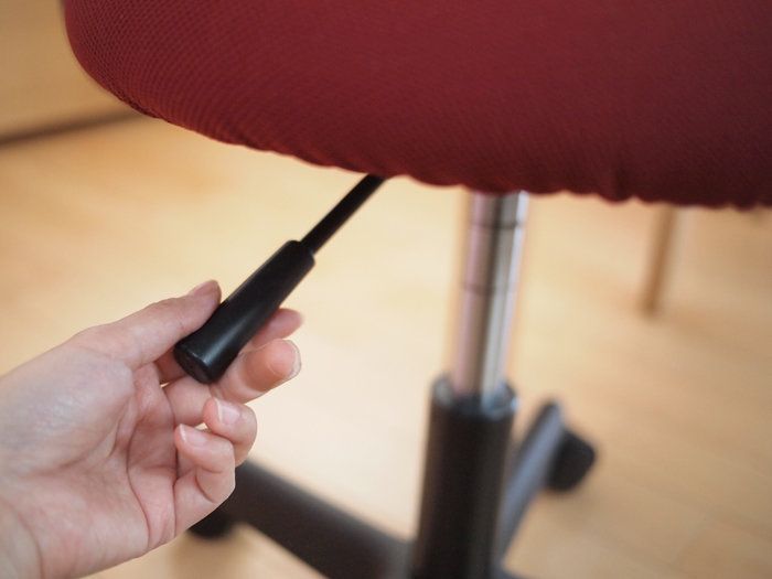一般的な会社用の椅子などとつくりは同じで、体重をかけてこのバーを引けば下がるし、体重をかけなければ上がる、という仕様です。ガススプリングというのがなんなのかよくわかりませんが、確かにガスの抜けるような感じでシューっと下に下がっていく感覚はとても楽しいです。