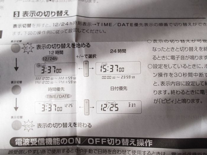 説明書とともに保証書もついています。ありがたいですね…表示の切り替えの方法など、詳しく説明書に載っており、簡単に切り替えることができるので安心です。また時間優先モードと日付優先モードがあり、どちらかといえば日付が知りたいという方のためにも表示の切り替えが簡単にできるようになっていて便利です。