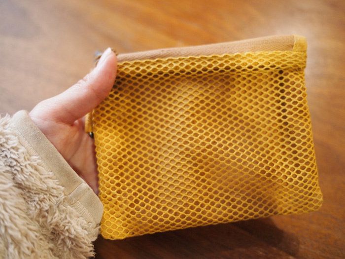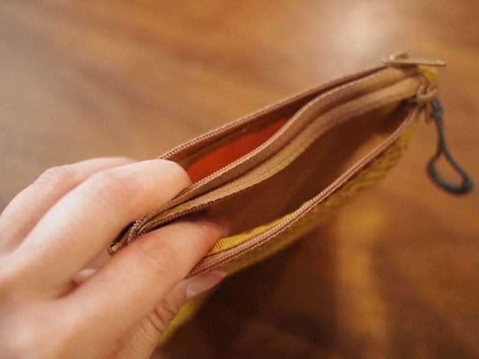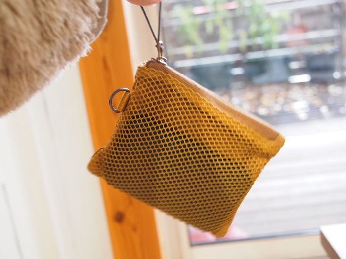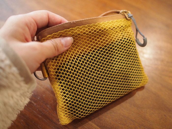 ダブルファスナーなので、入れ口が2つあります。メッシュになっている表面は、中に何が入っているか一目瞭然なのが素敵なところ。しっかりとポリエステルで覆われている裏面は、あまり目視する必要のないものを入れておくなど工夫ができます。