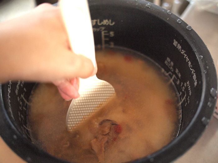 ご飯を炊くスイッチを入れる前に軽くかき混ぜておきます。全体的に満遍なくいきわたるように、少し丁寧にかき混ぜるのがポイントです。