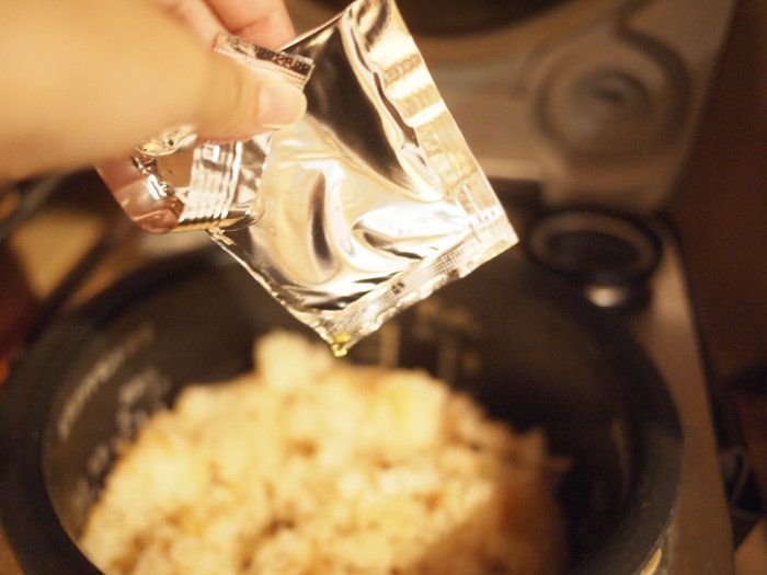 炊飯器のふたを開けたら、もーとてもいい匂い!玄関までいきわたるほどいい匂いでした!仕上げに付属のガーリックオイルをかけてまたかき混ぜておきます。ガーリックの匂いが効いてきて、これまたおいしそう…。
