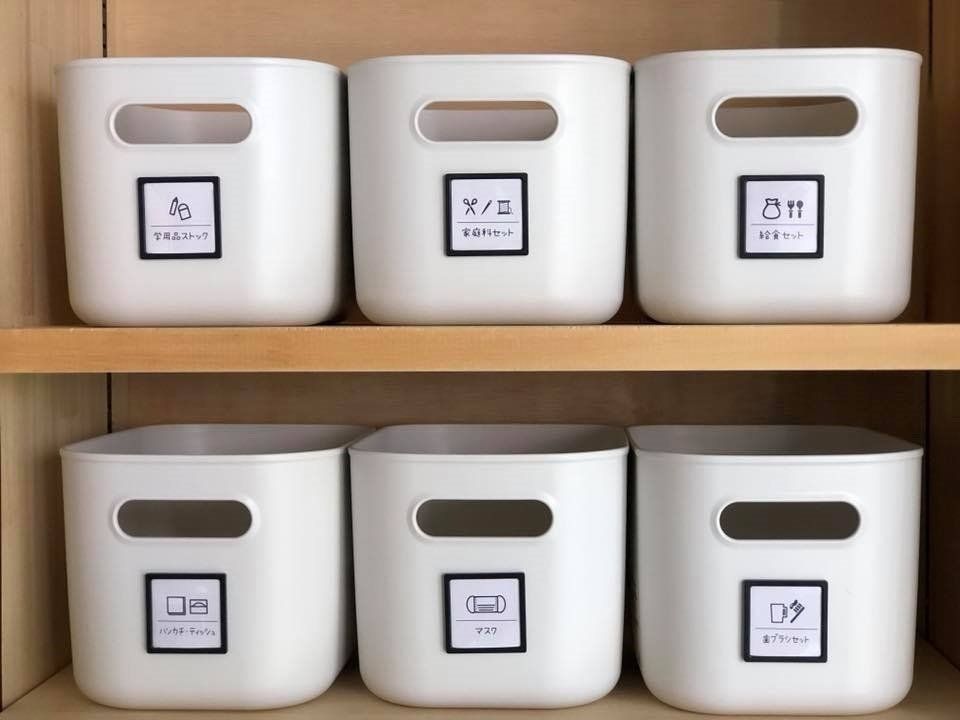 また、学校や幼稚園準備の際に必要なものを、1ヵ所にまとめて収納するのにもおすすめ。写真のようにラベルを貼ると、よりわかりやすくて便利です。自分で自分のことができるようにするためには、その子にとってのやりやすさが重要。わかりやすさと続けやすい仕組み、そして続けたくなる声かけなどが必要です。やりなさいばかりでなく、やれない理由を見つけ、やりやすい仕組みをつくると小さなお子さまもお片づけできちゃいます。