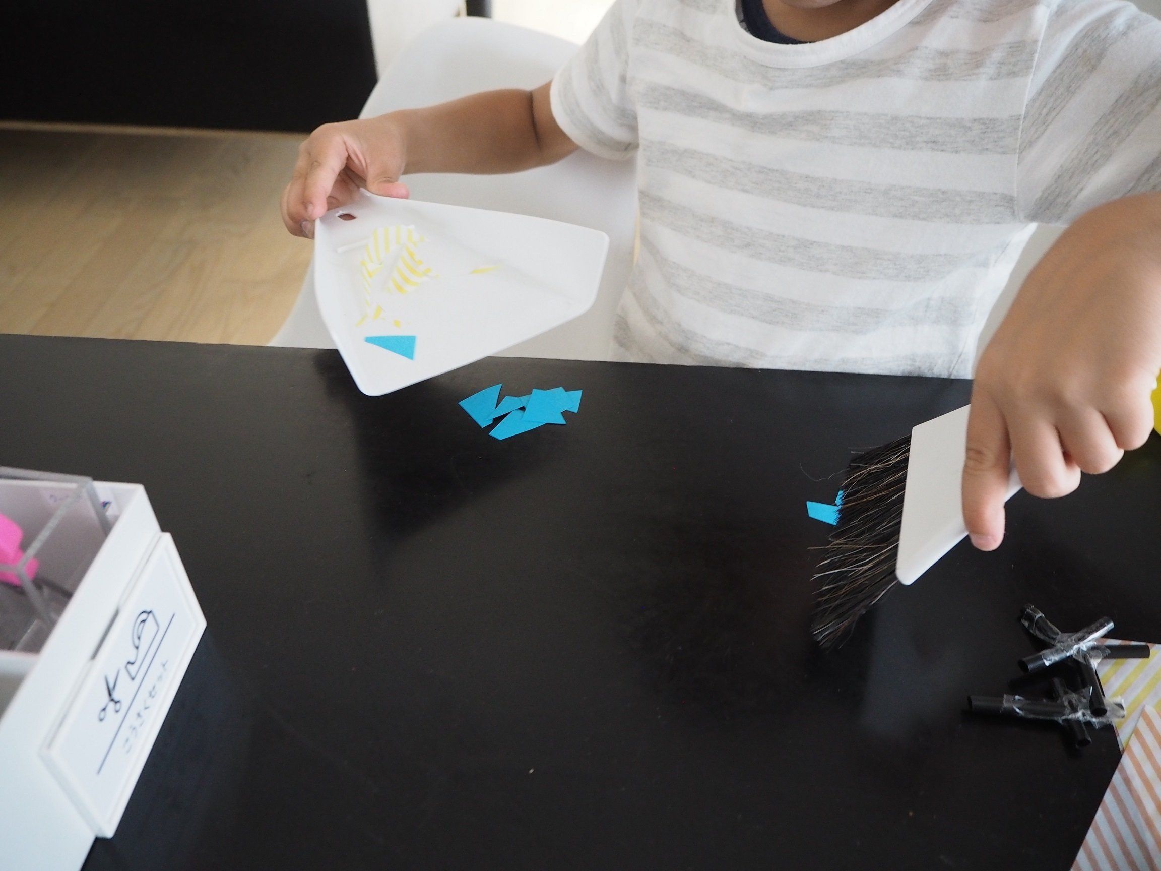 我が家には子どもが3人いて、ダイニングテーブルは工作をする子や宿題をする子、進研ゼミをする子などたくさんの活動拠点になっています。そんなダイニングテーブルには消しゴムの消しくずや工作の切りくずなどが散らばりがち。