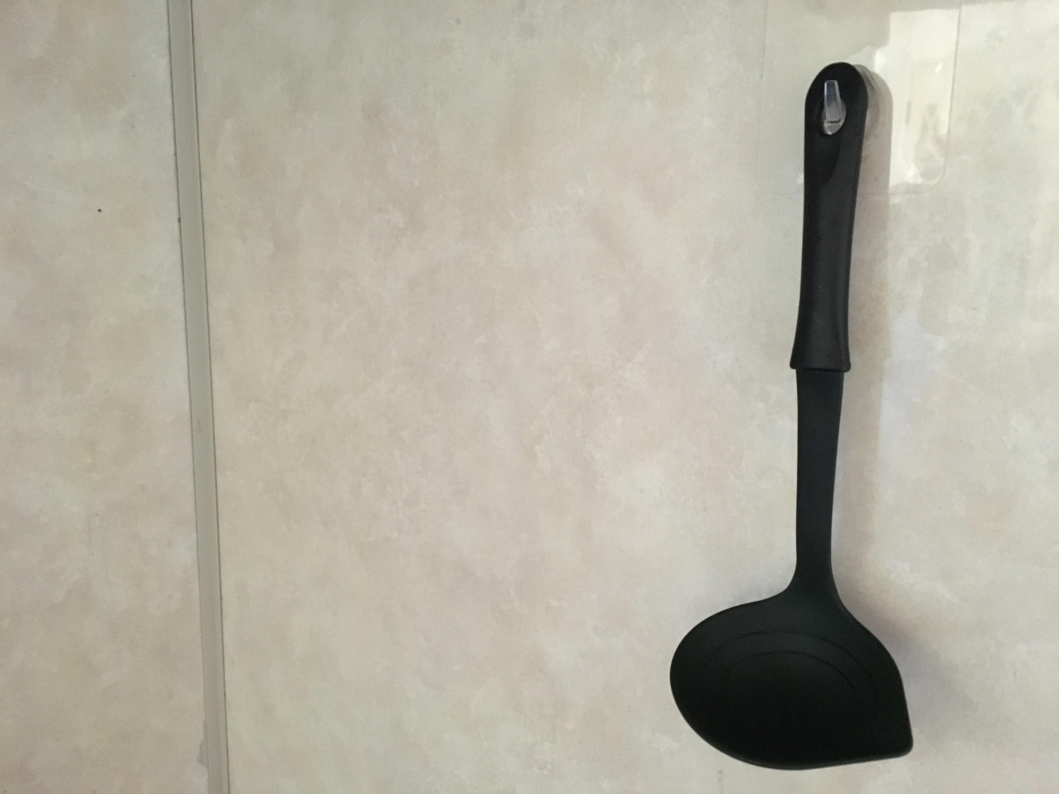 キッチンはサッと取り出して使いたいものが多いので、このフックがピッタリ。ハサミやおたまなどの頻繁に使うアイテムはもちろん、耐荷重約1.5kgなので材質やサイズにもよりますがフライパンも掛けることができますよ。
