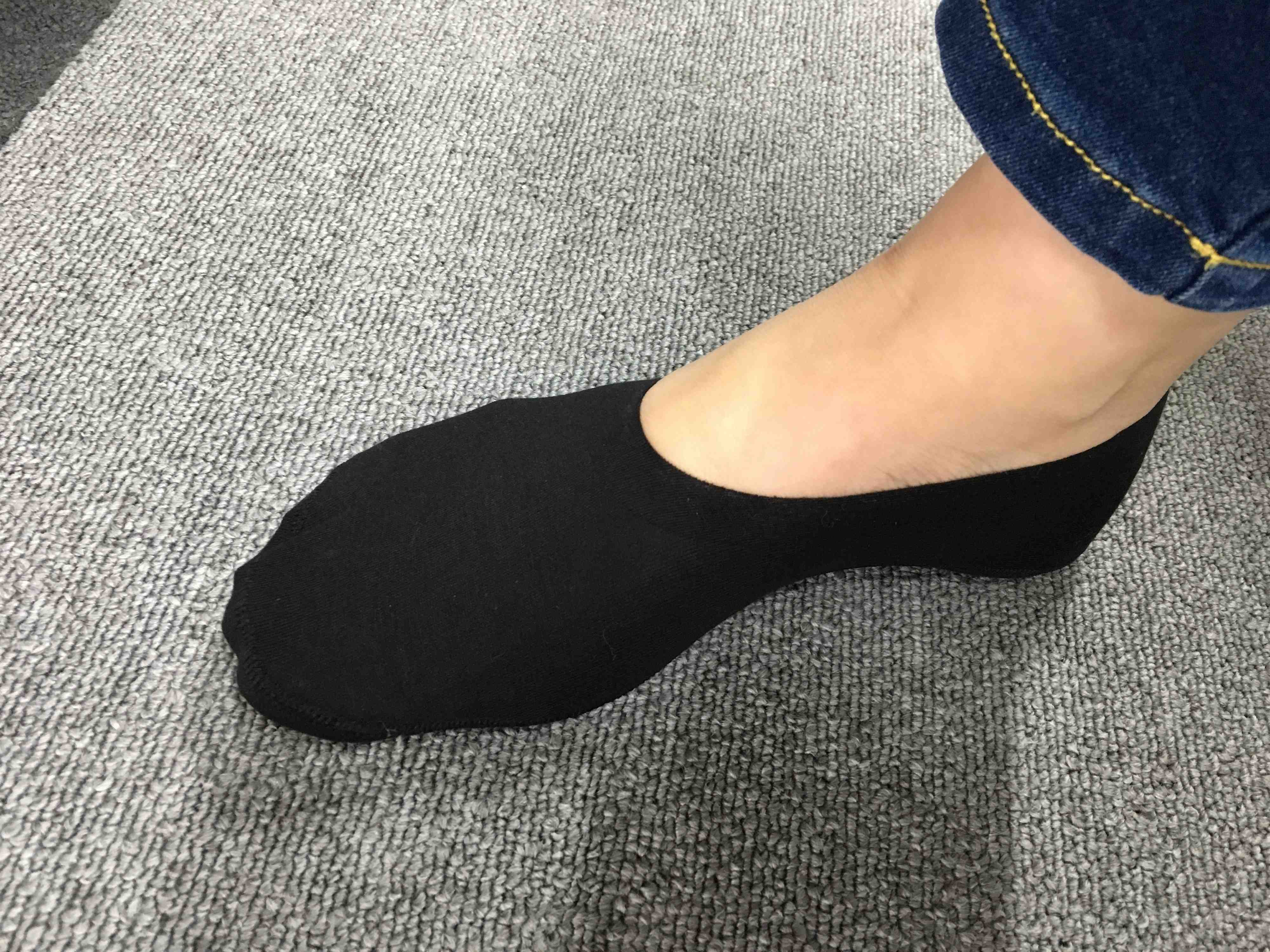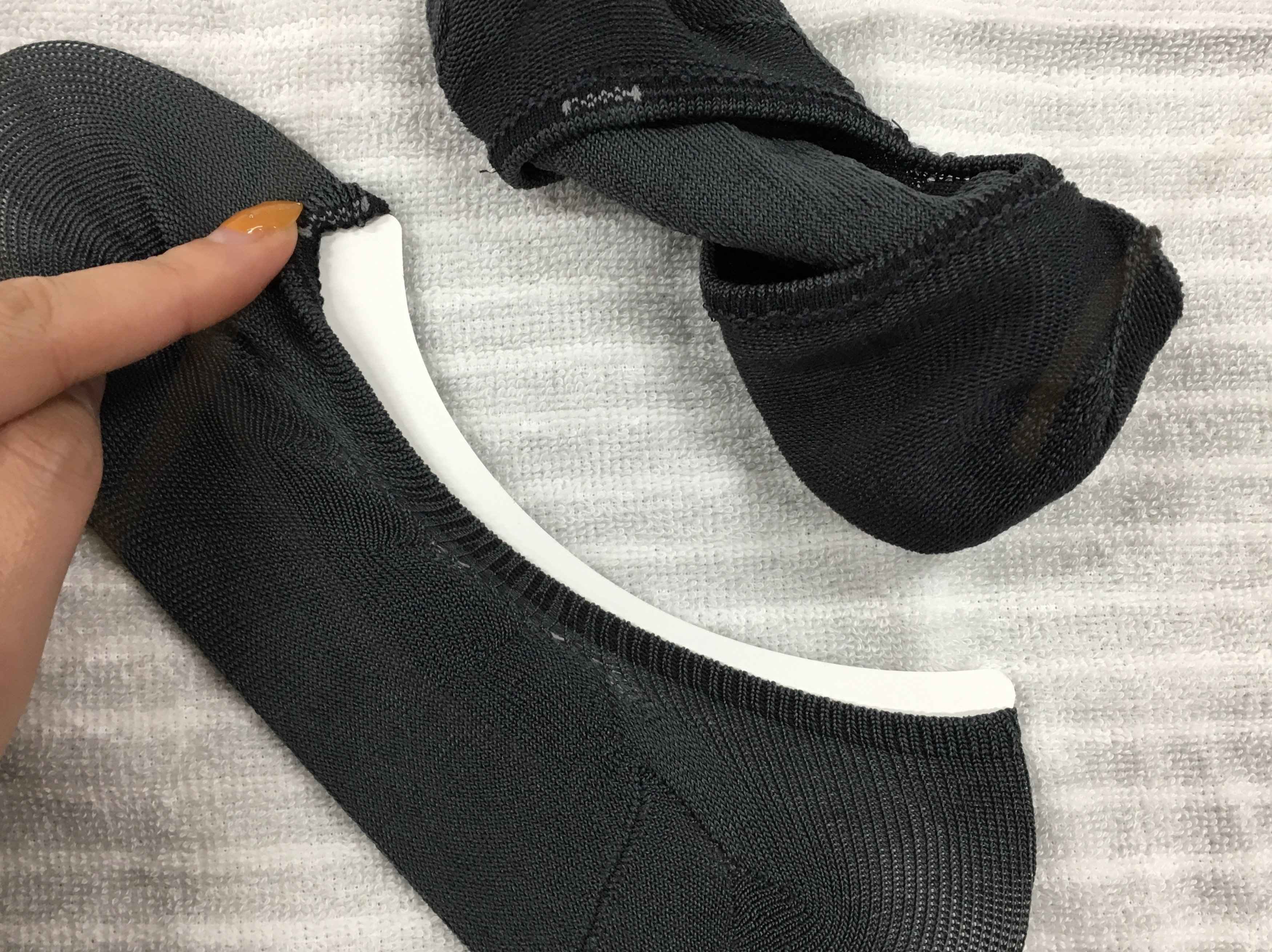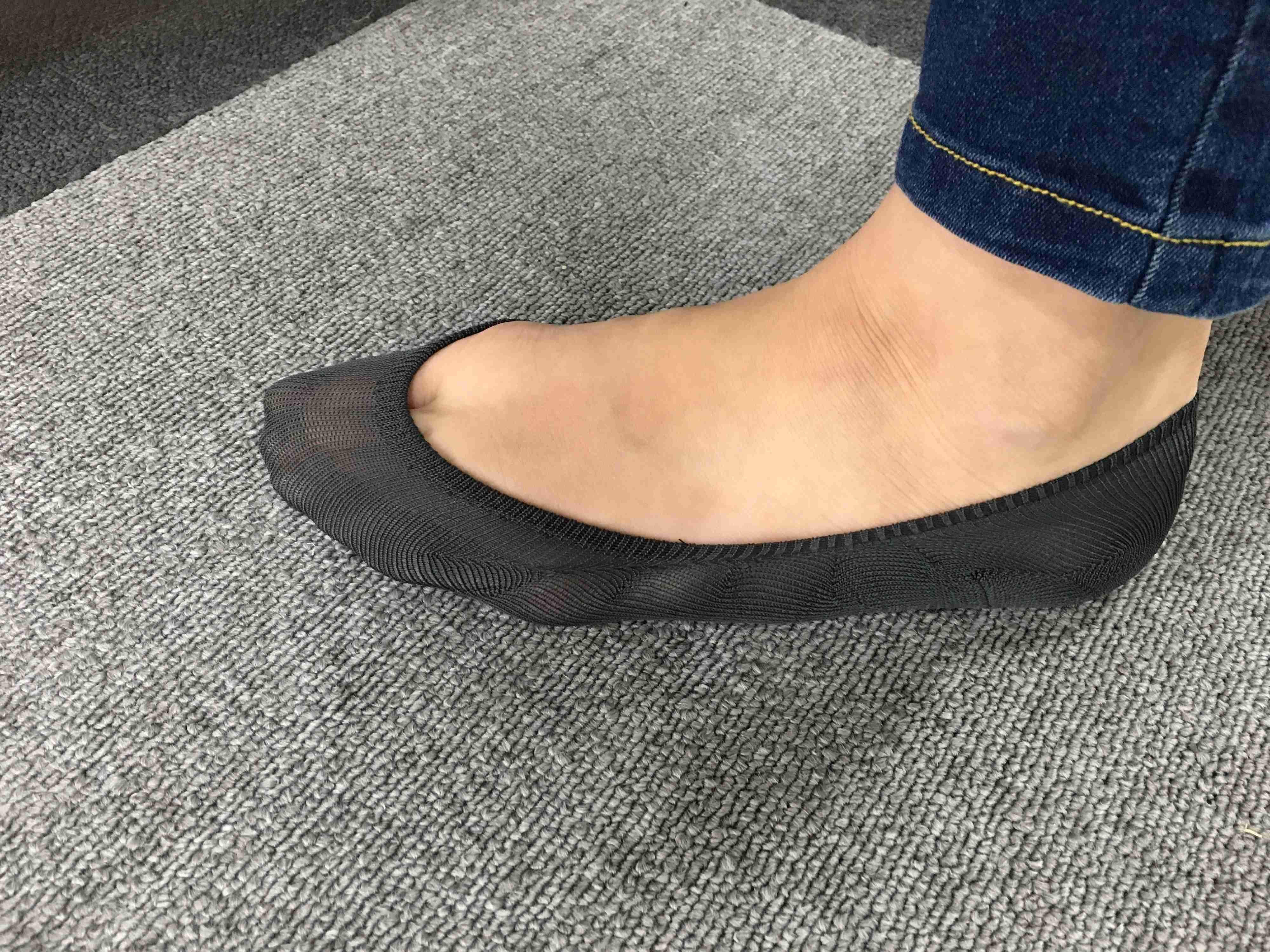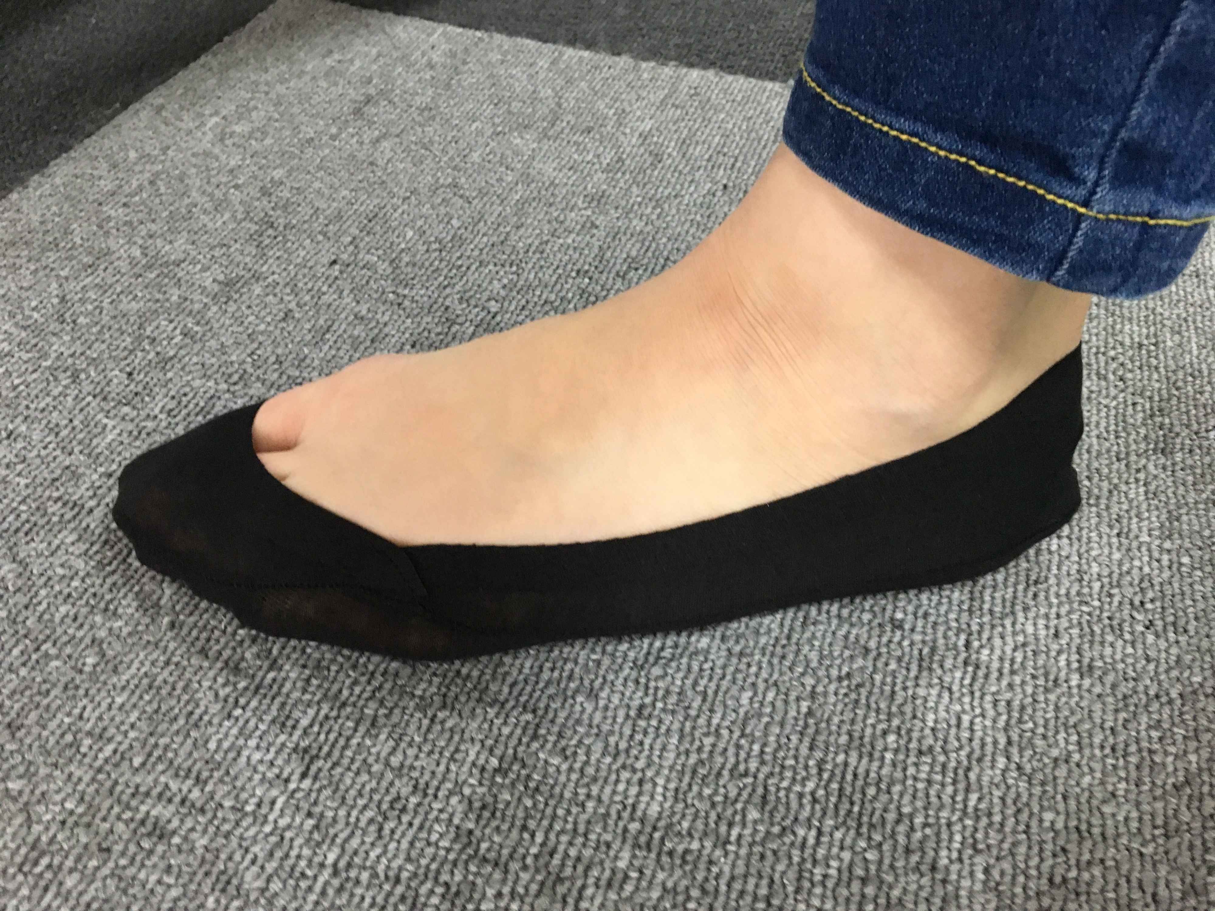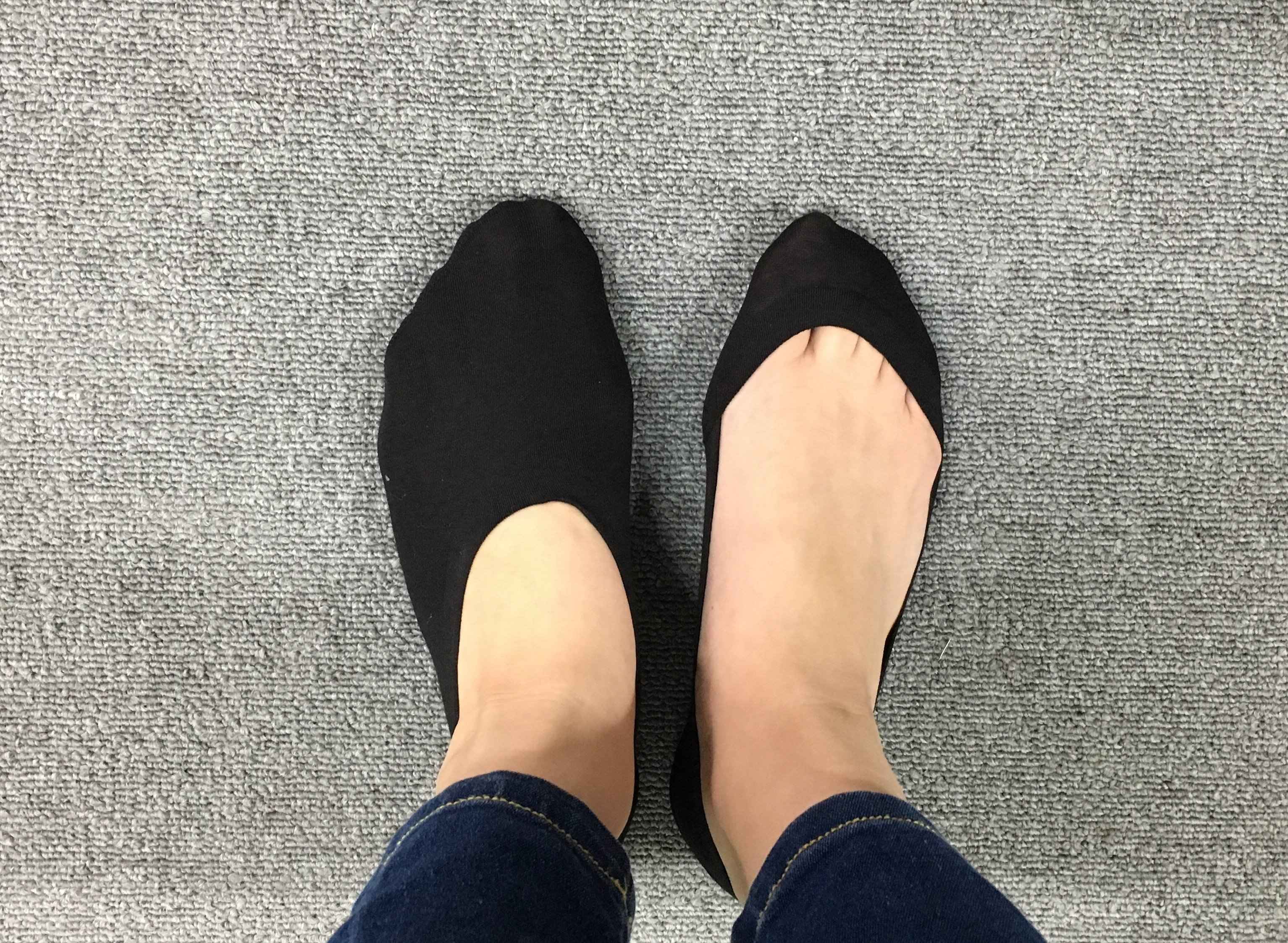 続いては同じシリーズの「更に浅履きタイプ」のもの。素材は同じく綿混ですが、はいてみると指が見えるほど浅め。しかし、かかとの滑り止めが効いて脱げにくくなっています。