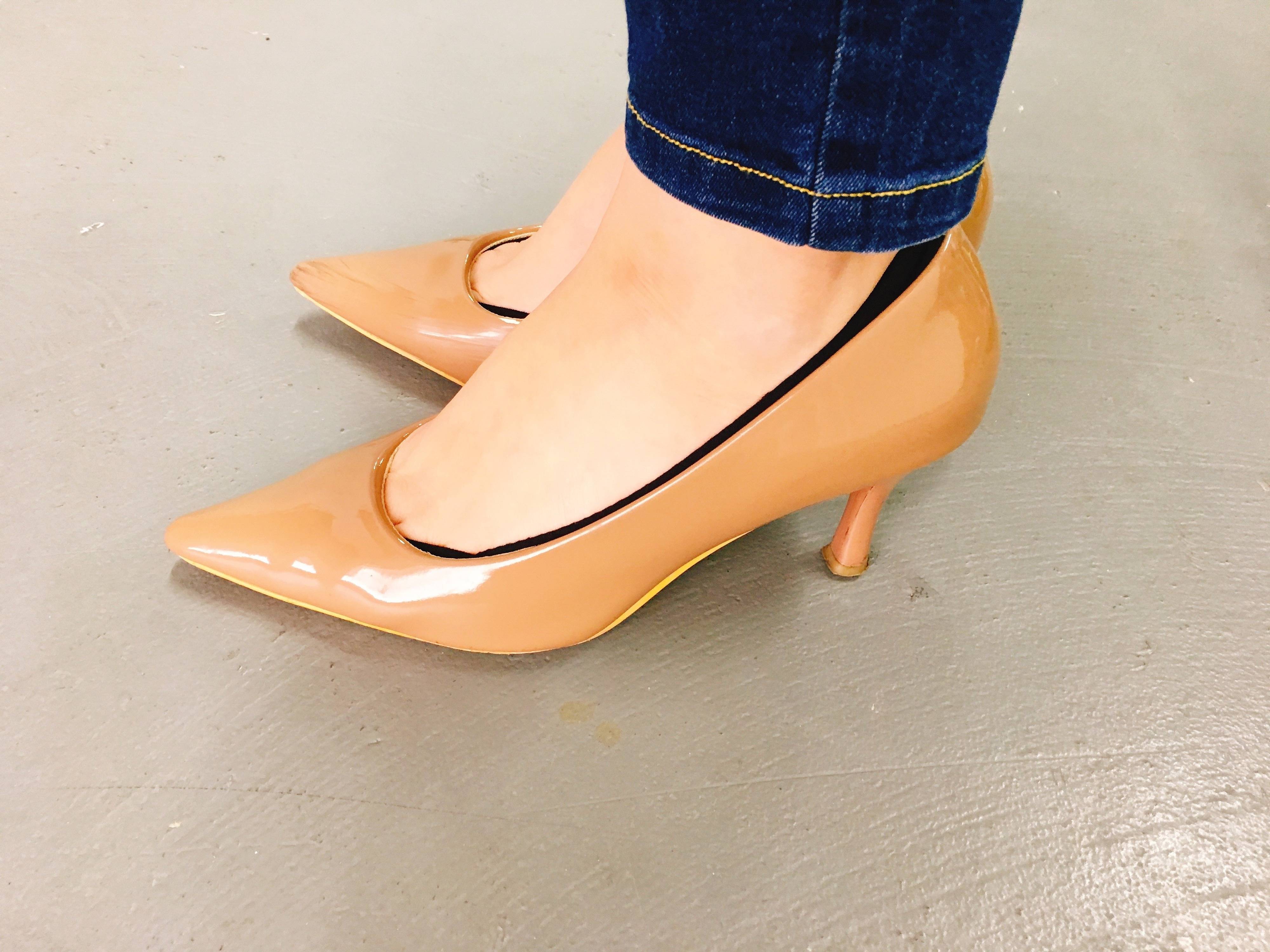 パンプスを履いてみると、サイドから見てちょっとだけ靴下生地が見える程度。写真ではわざとベージュ色を履いていますが、ダーク色の靴なら見えずにスッキリしています。