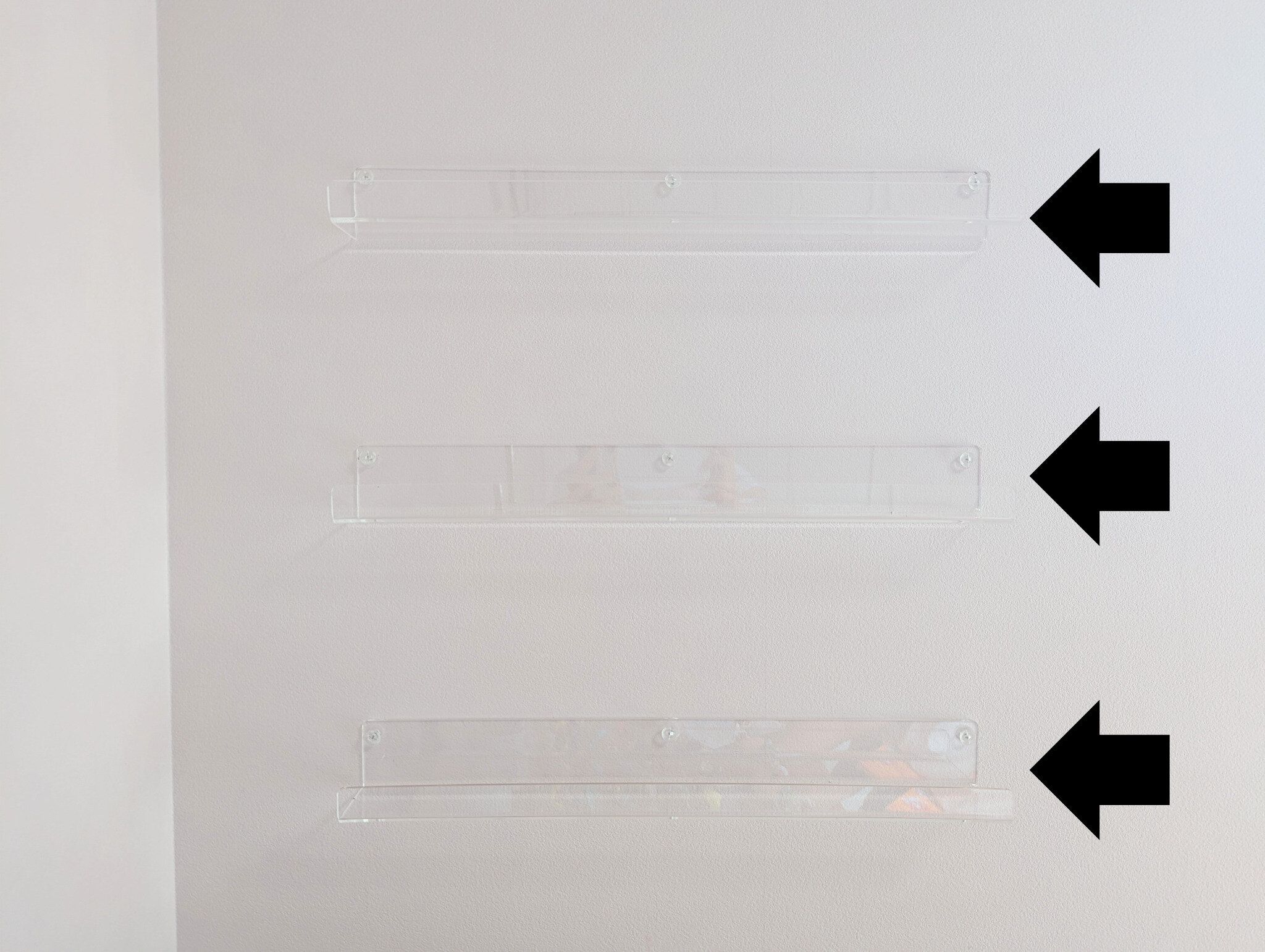 無印良品の「壁に付けられるアクリルディスプレイ コの字型」は、そんな"見せる収納"にぴったり。しまう収納に限界を感じている方は、発想を変えて試してみては。棚の数をあらかじめ決めて、「細々したおもちゃはここに入るぶんだけ」とルールをつくってみるのも良いかもしれません。