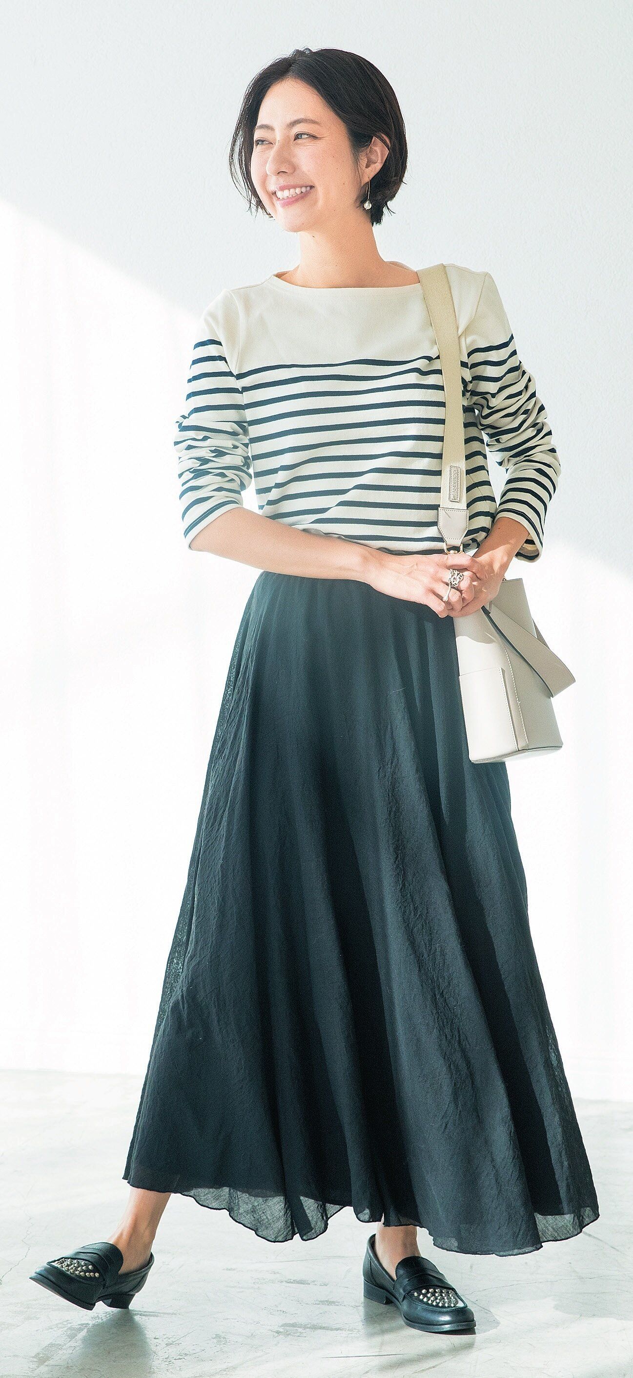 ボーダーにはくるぶしまでのロング丈スカートが合う。ウエストインして上半身をコンパクトにまとめるとグッドバランス。