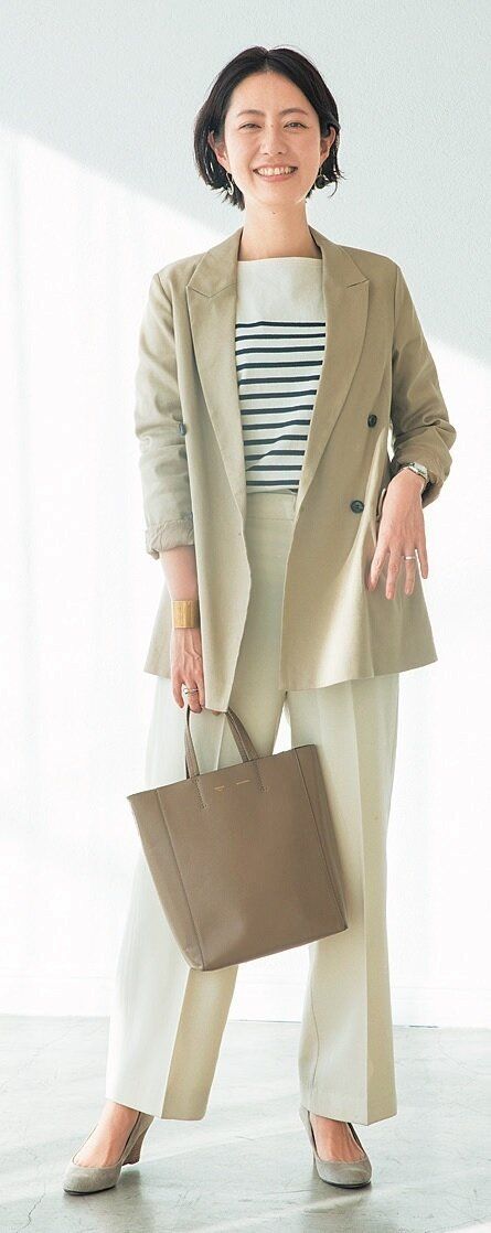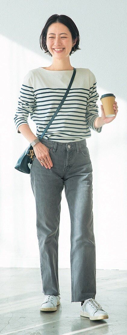 ボーダーは強めの柄なので、合わせるジャケットとパンツ、小物はすべて同系色でまとめるのがポイント。