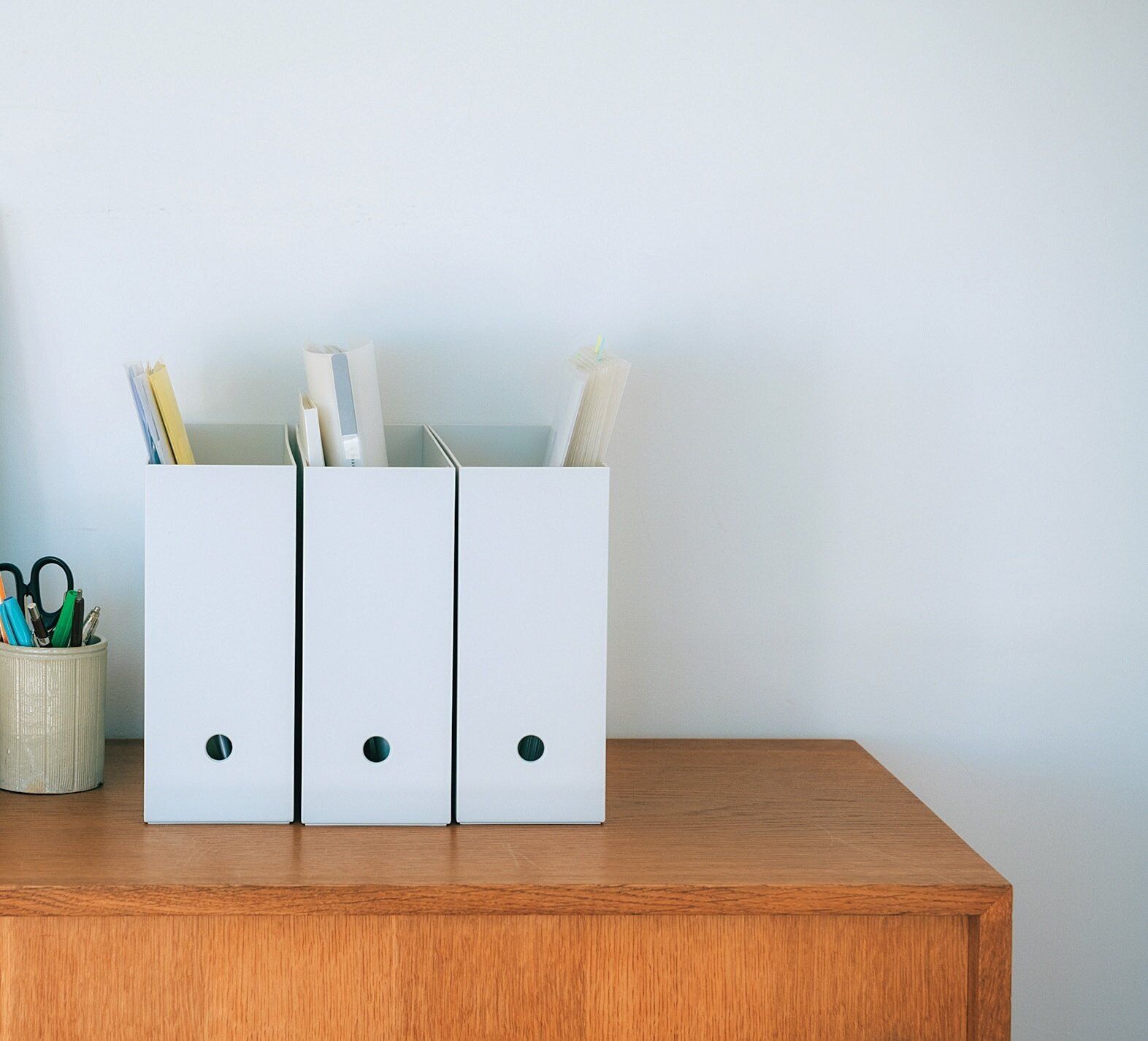 落ち着きのあるホワイトグレーでインテリアになじむ。穴に指を掛けると引き出しやすい。(約幅10×奥行き32×高さ24cm) 各¥446