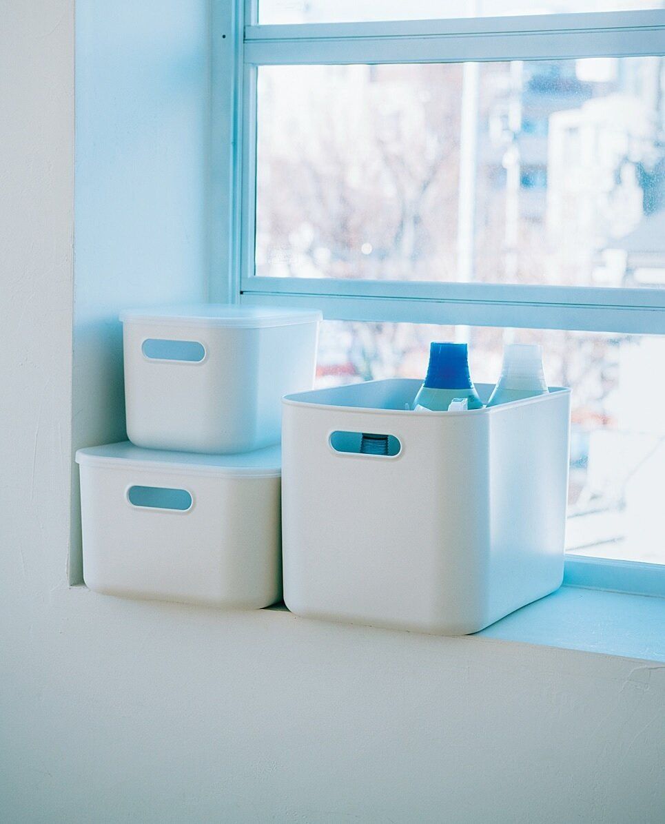 半透明で中身をぼんやりと隠してくれるので生活感が出すぎず、外から中身も把握できる。(約幅34×奥行き44.5×高さ24cm) ¥1,082