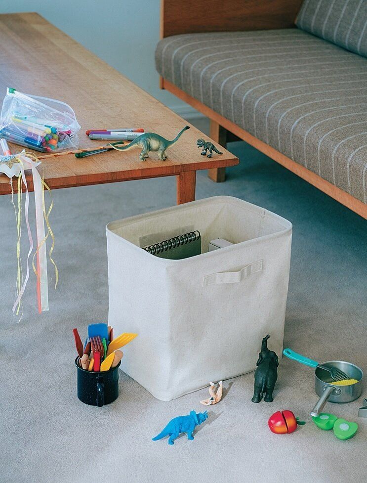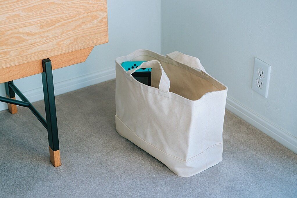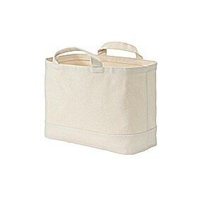 持ち手つきでバッグ感覚で使え、コンパクトにたためる布製バスケット。丈夫で自立する。(約幅37×奥行き18.5×高さ26cm) ¥1,355