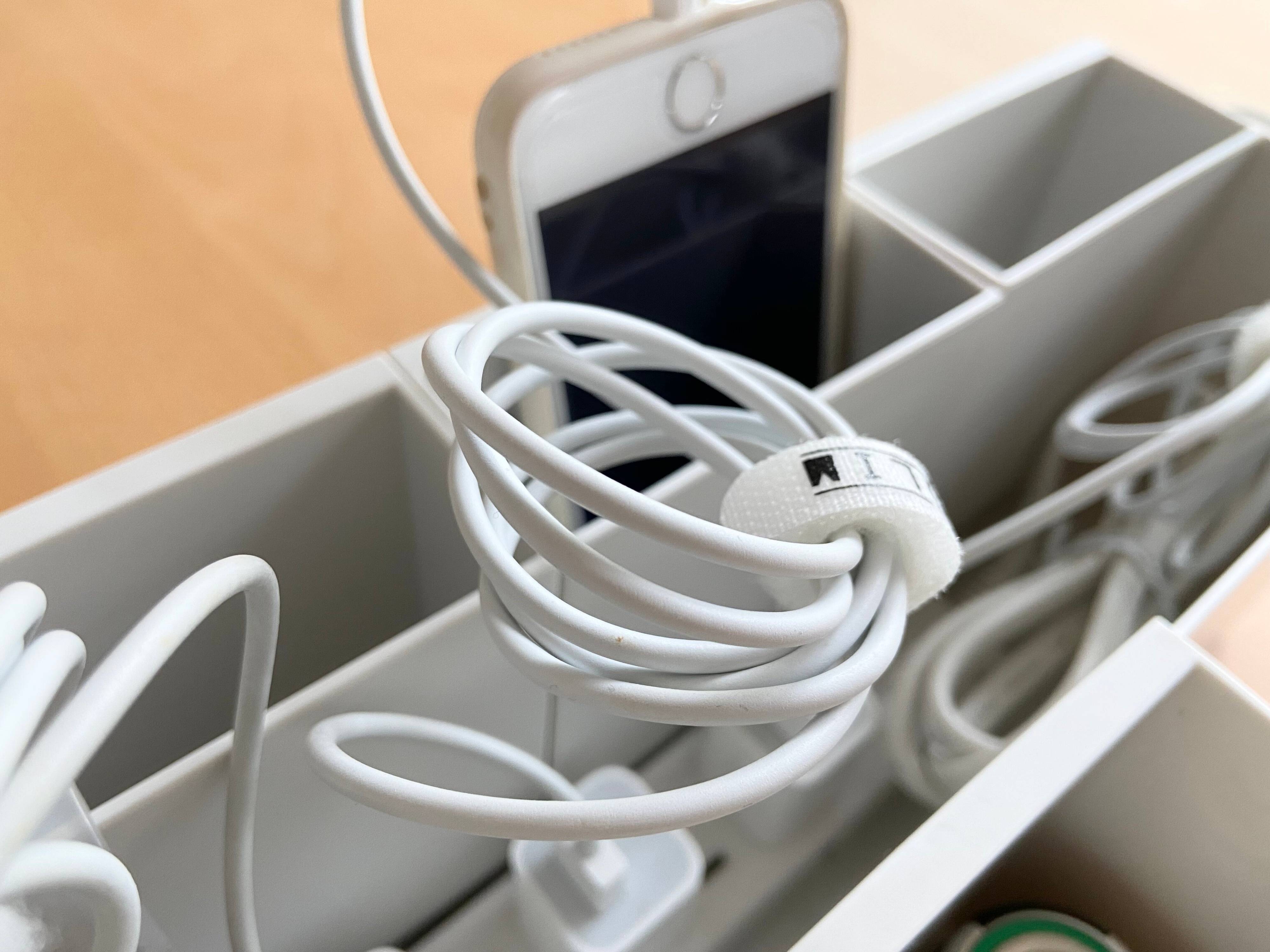 あまり長い配線には対応していませんが、携帯のUSBケーブルの長さはぴったり綺麗に収納できます。