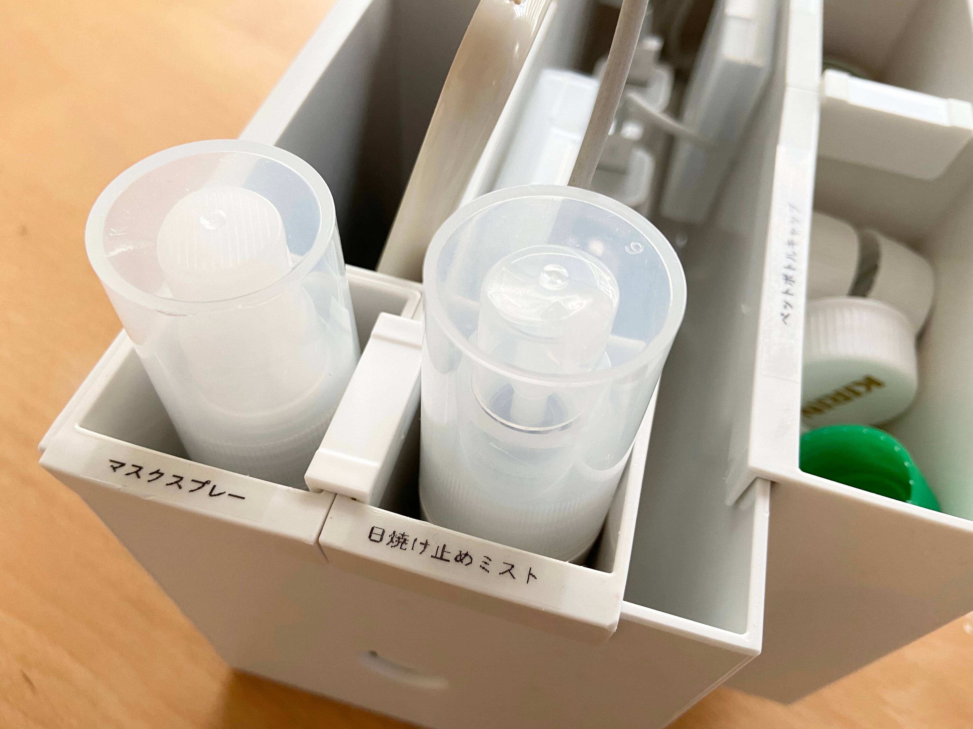 ペンポケットには玄関に別で置いていたマスクスプレーと日焼け止めミストを、ポケットには使い終わった乾電池とペットボトルの蓋を収納。全て玄関にバラバラで置いていたものたちをひとまとめにしてスッキリさせました。