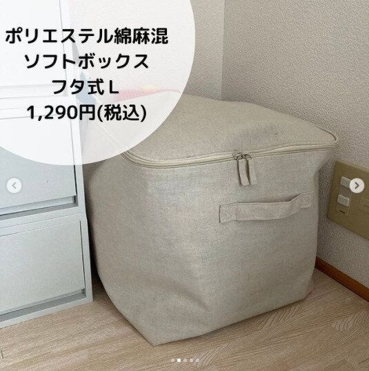 シーズンオフの衣類や子供のおもちゃなど、ガバッっとたくさん入れられるケースがほしいときは、こちらの「ポリエステル綿麻混・ソフトボックス・フタ式・L」1,290円なら、いっぺんにたくさん収納できますよ。