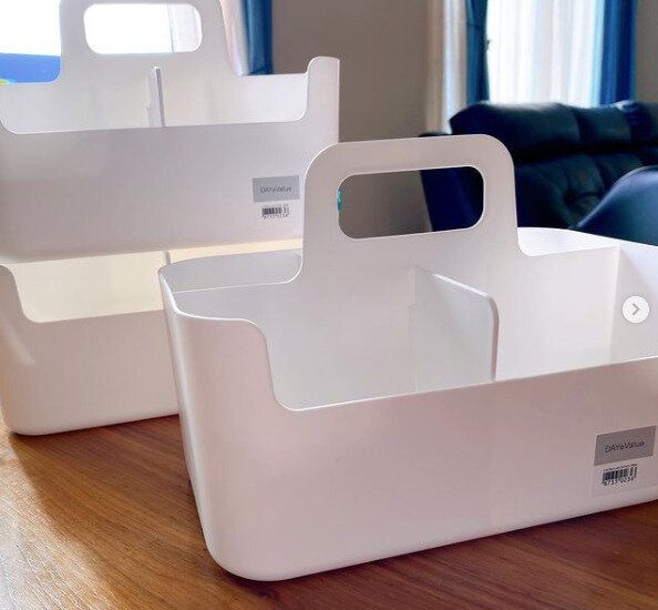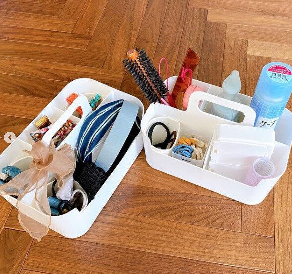 「いくつあってもOK」だと話題のアイテムが「ハコブNインボックス」(599円)になります。持ち手がついているため、ボックスごと持ち運びしやすいのが特徴。おすすめの使い方は、化粧品やヘアゴム、ヘアケア用品など、少しこまごましたものの収納がよいでしょう。仕切りがついているので小分けしやすく、さらに、大きなポケットの仕切りはアイテムに合わせて取り外しもできるところが便利です。ポーチとは違い、上がオープンなため、スプレーやヘアブラシなど、高さがあるものも収納できるでしょう。何個もそろえて買いたい万能収納ボックスです。