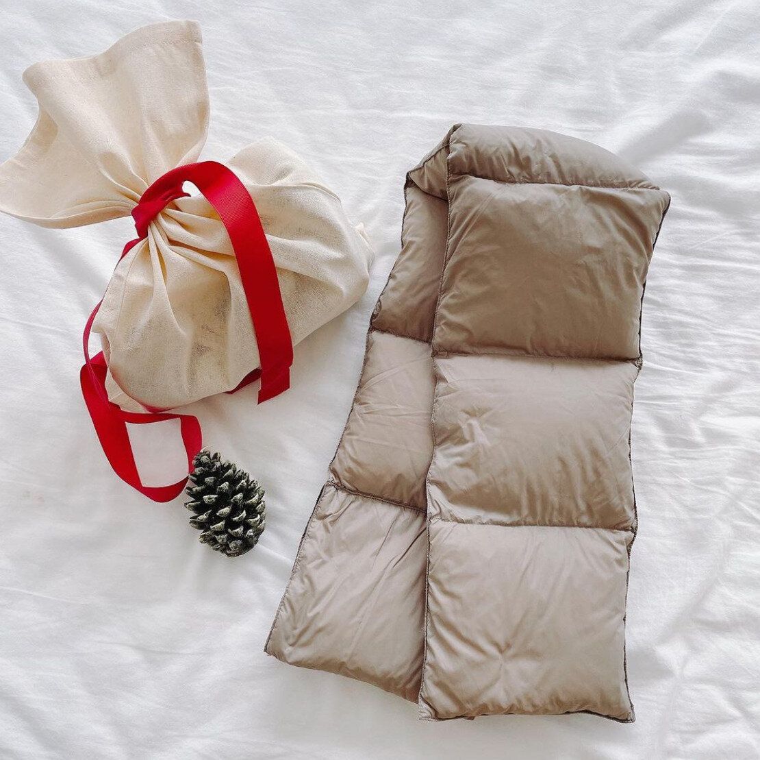 「とっても軽量なのに暖かい!」と話題になり、愛用者も多数の軽量ポケッタブル ダウンマフラー。お値段は1,990円です。生地が柔らかくすぐに暖かくなるので、マフラーのチクチク感が気になるかたにもおすすめです。片方の輪にとおしてコンパクトに使えるのもポイントですよ。