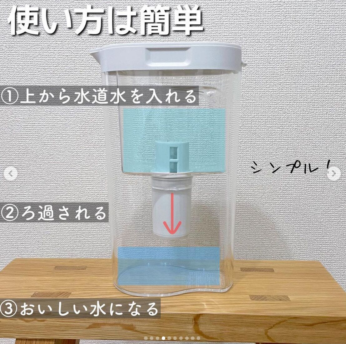 品薄になるほど人気のアクリル浄水ポット。お値段は2,990円です。使い方も簡単で、ポットに水道水を入れて、専用のカートリッジを通してろ過されるのを待つだけ。取っ手がないので冷蔵庫にコンパクトに収納でき、ポットの上部には持ちやすいくぼみがついています。