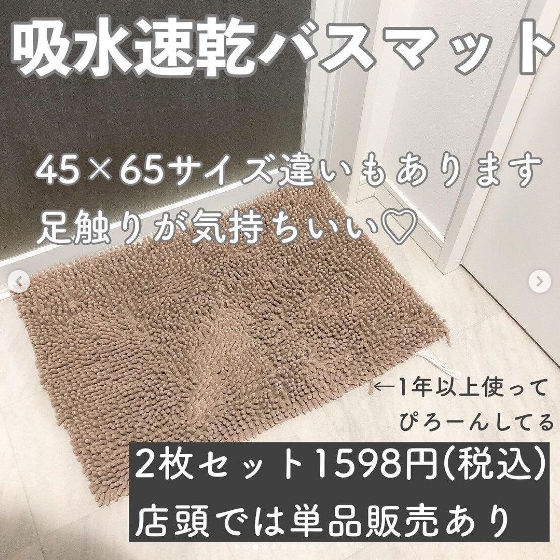 ふわふわの長めの毛足が気持ちよく、長期間使用しても傷みにくいと人気を集めている吸水速乾バスマット。リピーターも多い人気商品です。こちらは幅45×奥行65cmで、価格は1,598円。うれしい2枚セットで、サイズ違いもあります。洗濯機OKなのでお手入れも簡単ですよ。