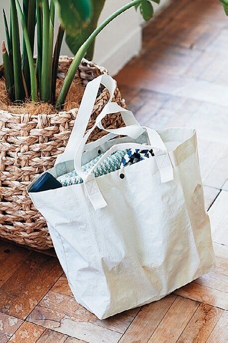 養生シートなどに使われる丈夫な素材で、ぬれ物の持ち運びにも。ざっくりたっぷり収納できて、長短2種類の持ち手つき。
