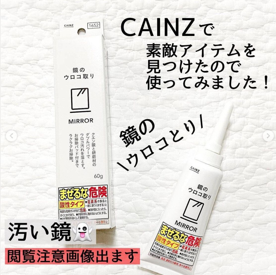 クエン酸と研磨剤でラクラク汚れを落とせる、鏡のウロコ取り。60g入りで698円です。使い方は、付属のお掃除パットに適量を出してこするだけ!放置せずに水で流します。「1回でも結構キレイになる!」と評判で、繰り返し使うことでよりピカピカになりますよ。