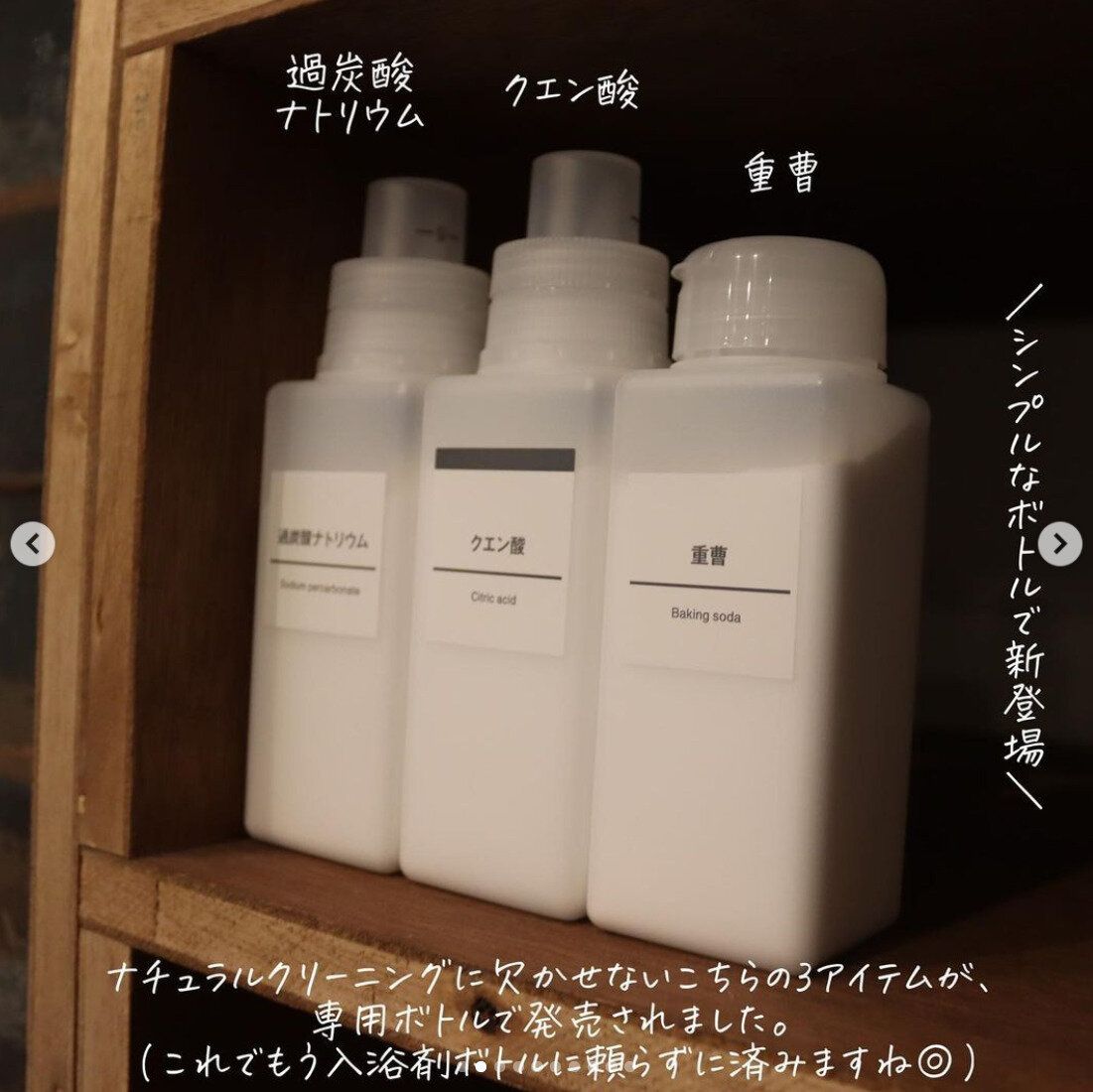 そのまま置いておくだけでインテリアとしても映える、過炭酸ナトリウム、クエン酸、重曹。過炭酸ナトリウムとクエン酸はどちらも490円で、重曹は390円です。「シンプルでかわいいボトルのフォルムに惹かれる!」という声も多く、袋のまま使用するより、お掃除の効率も気分もアップしそうですね。