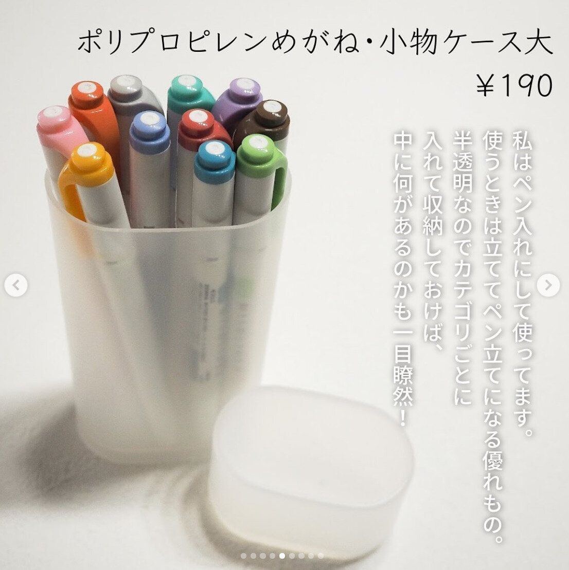 こちらは、無印良品のポリプロピレンめがね・小物ケース スタンド式・大。お値段は190円です。メガネケースやペンケースとしても使えるというすぐれもので、シンプルでクリアな素材なので、中身が見えやすく使いやすいのがポイントです。持ち運びにも便利ですよ。