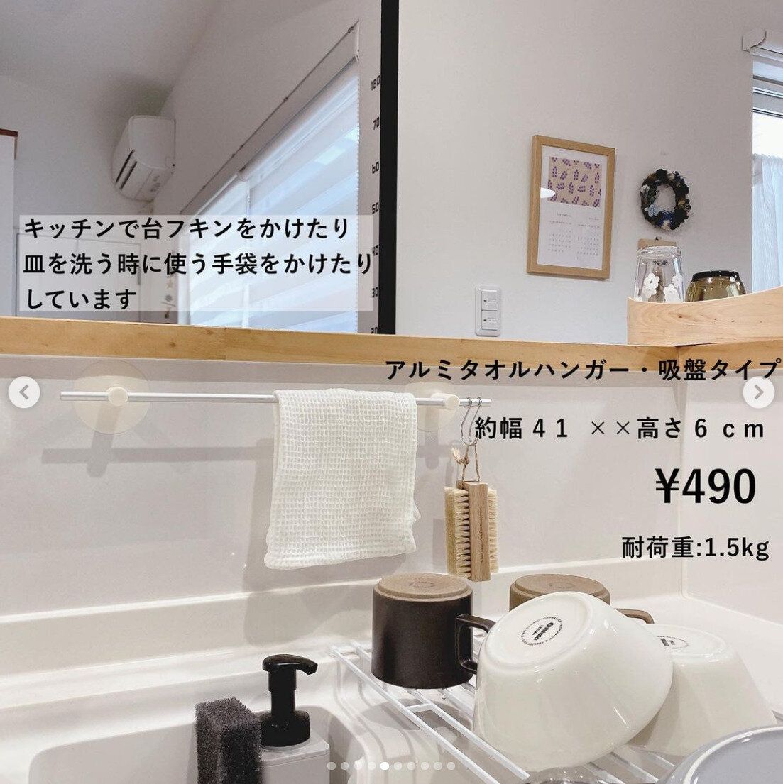 アルミタオルハンガー・吸盤タイプをキッチンの壁に貼りつければ、タオルをかけたり、キッチンツールを吊るしたりと、便利な収納スペースが完成します!お値段は490円でプチプラなのもうれしいところ。洗濯機につけるなど、場所別に使用するのもおすすめです。