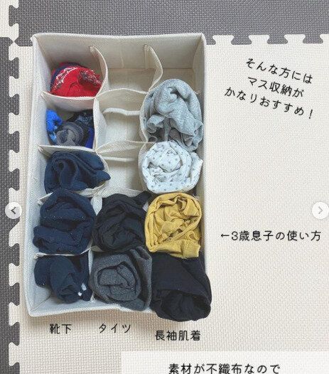靴下や肌着類は、きちんとたたんで入れても、すぐに引き出しの中でぐちゃぐちゃになってしまいますよね。そんな悩みを解決してくれるアイテムが「引き出し整理ボックス」(8マス・15マス それぞれ299円)になります。使い方は簡単で、ボックスが入っていた外袋から出して広げたら引き出しに入れるだけ。マスに合わせて、靴下や下着をぽいぽい収納しましょう。マスの中で動かないため、引き出しの中をつねにきれいに保てるでしょう。また、肌着はマスの大きなものに入れるのがおすすめです。ボックスの素材は不織布のため、広がってサイズに融通がきくのも高ポイント。リーズナブルな価格なので、いくつもそろえたくなりますね。