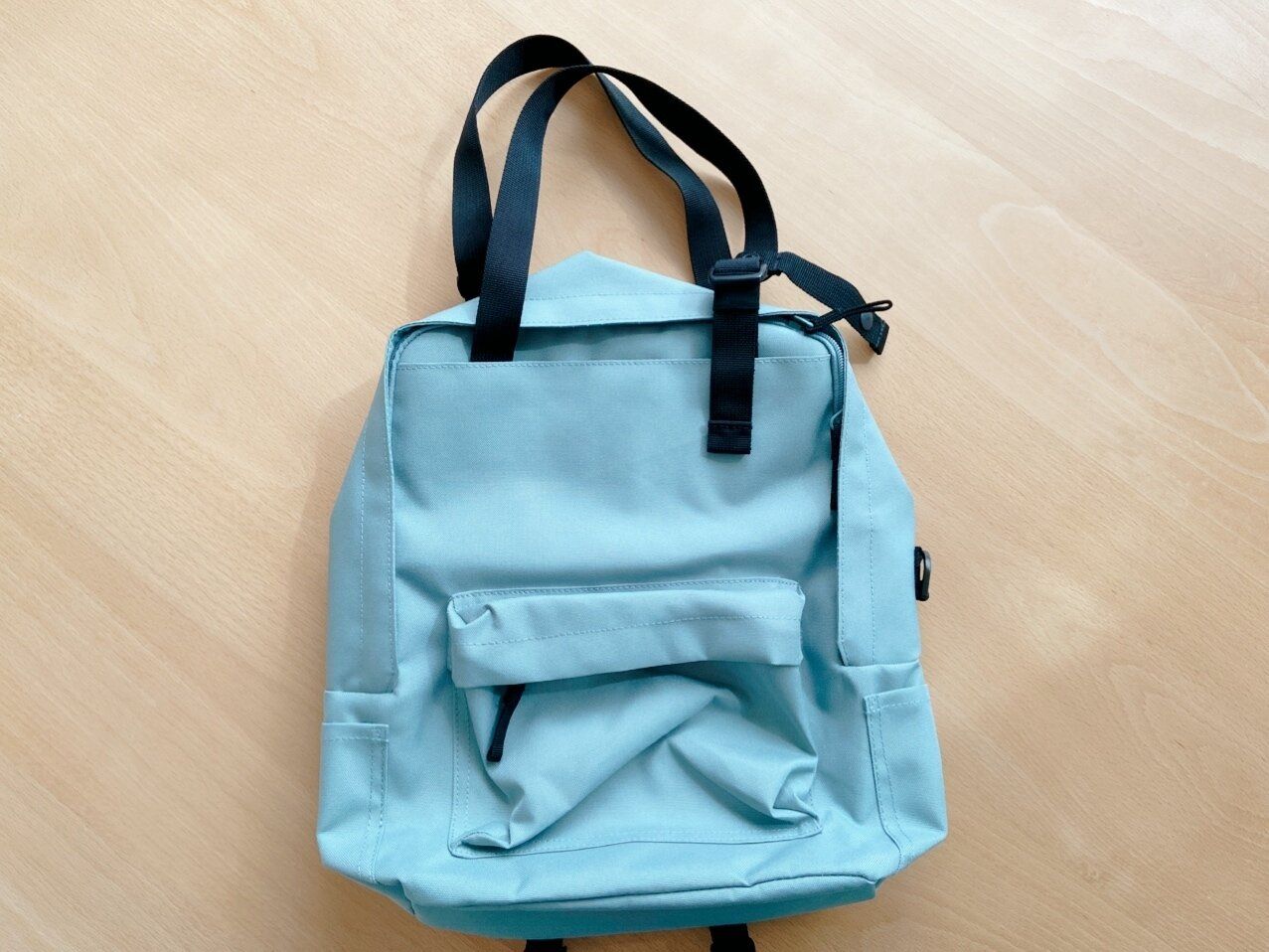 このリュックの最大の特徴が長さが調節できる手提げのベルトが付いていること。ベルトを長くして肩掛けカバンにしたり、短くして手提げにして使ったり、収納すればリュックになって3WAYで使えます。