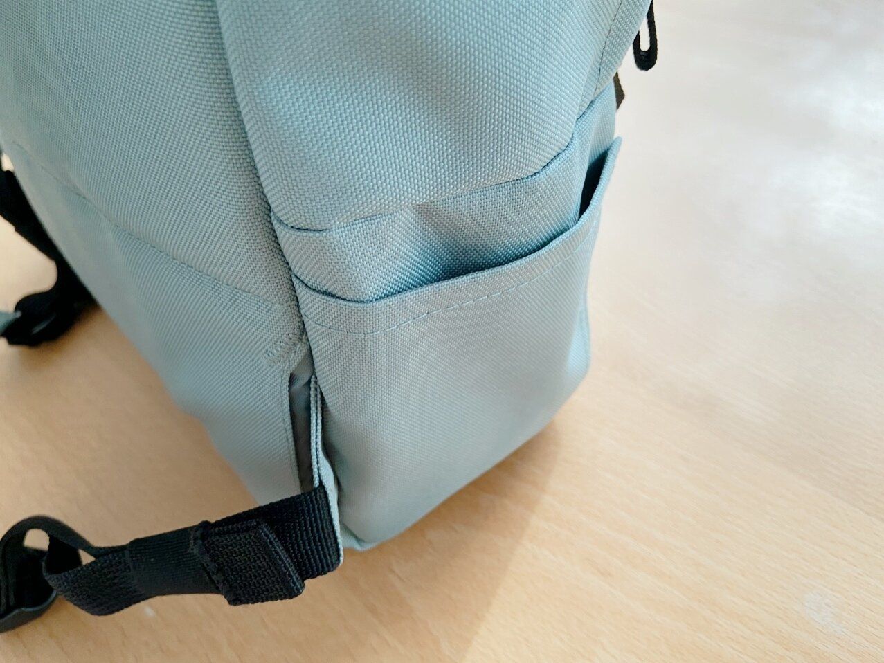 色んな工夫満載のリュックなのですが、サイドのポケットはやや小さめ。文房具やおしぼり、ハンカチを入れるくらいのサイズ感。ここにペットボトルや細めの水筒でも入るサイズだともっと良かったかなという感じです。