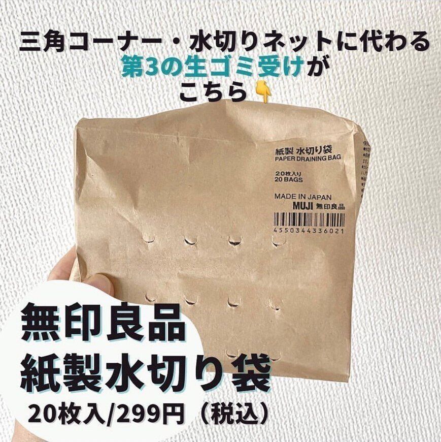 三角コーナーや水切りネットを使うのが一般的ですが、少しでも脱プラしたいなら、「紙製水切り袋」を生活に取り入れてみませんか?20枚入りで299円と価格も手頃です。