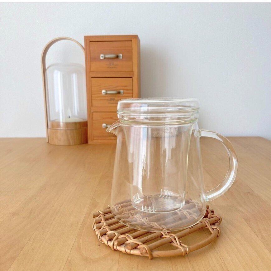 こちらはFound MUJIの「耐熱ガラス・ティーポット・ストレート型」(2,200円)になります。ドイツのイエナ創業のガラスメーカーのもので、ほかとは違った平たいフタなのが特徴的です。すべて透明なので中身の様子がしっかりと確認でき、形が台形なので茶葉もコップに移ることなく注ぐことができます。なかなか見ないステキなデザインなので、高見え間違いなし!