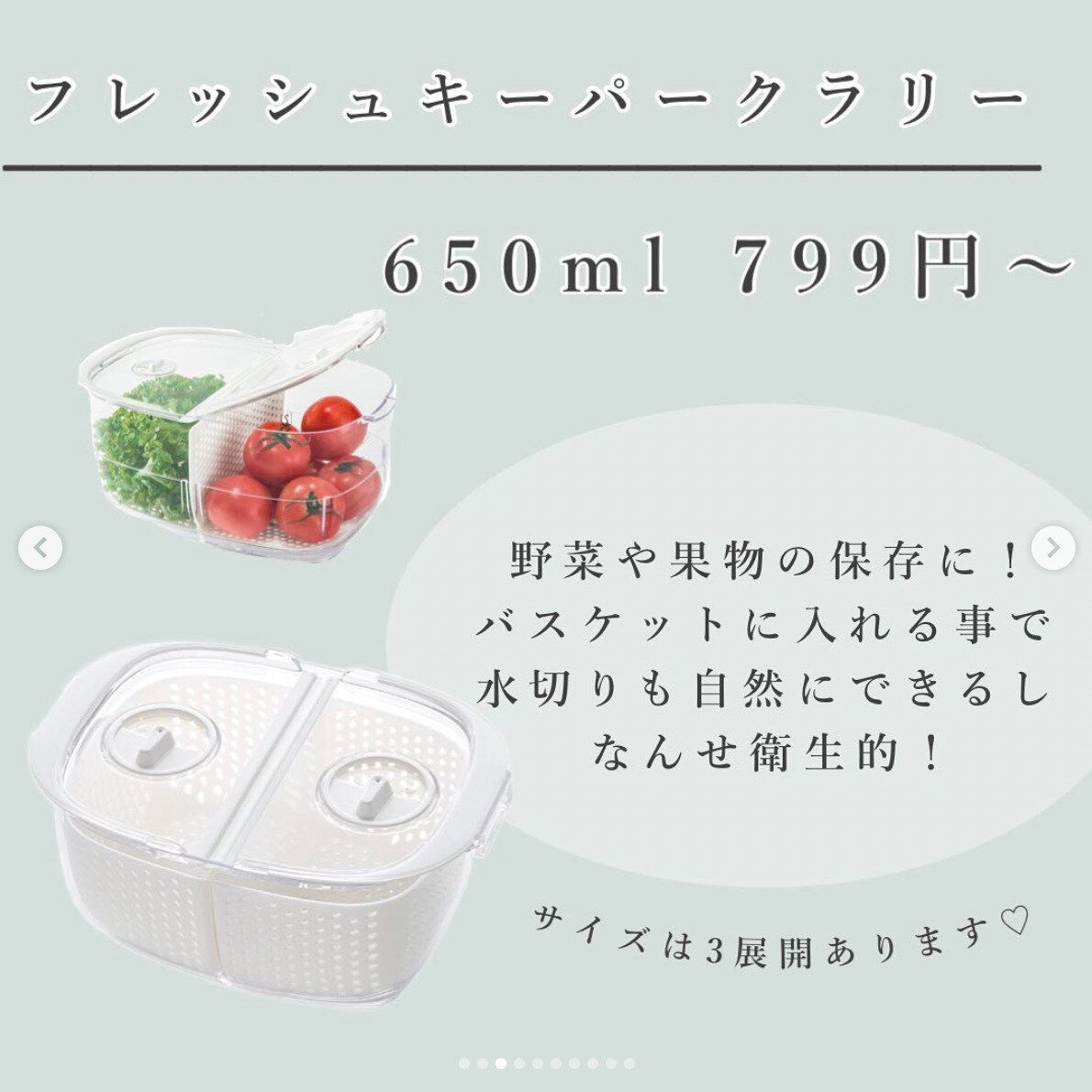 冷蔵庫で野菜や果物の保存に使いたいアイテム。中のバスケットで自然に水切りができるため、食材の日持ちが良くなります。仕切りがあって1つの容器の中に2つの食材が入れられるのはうれしいですね。ちょっと余った食材を省スペースで一緒に入れておけます。S・M・Lの3サイズ展開です。