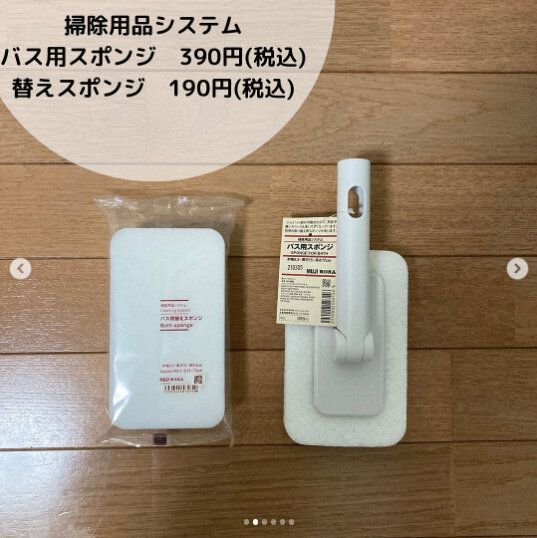 お風呂掃除で大活躍の「掃除用品システム バス用スポンジ」390円。ジョイント部分が可動式で、洗いにくい場所にもスポンジが届きやすくなっています。