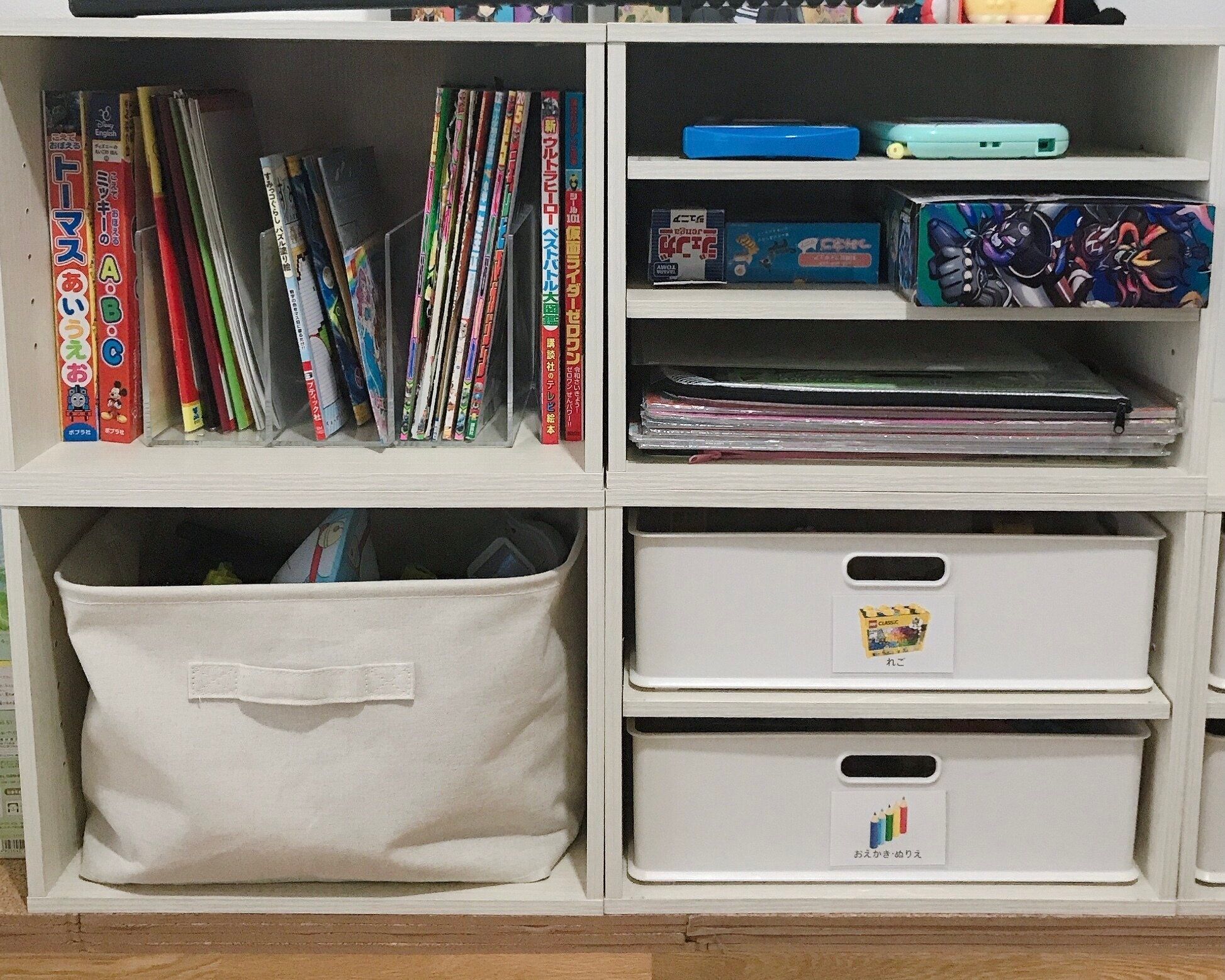 絵本を置いたり、パズルを横置きしたり直置きするパターンと収納ケースをカラーボックスに入れるパターンで使い分けています。