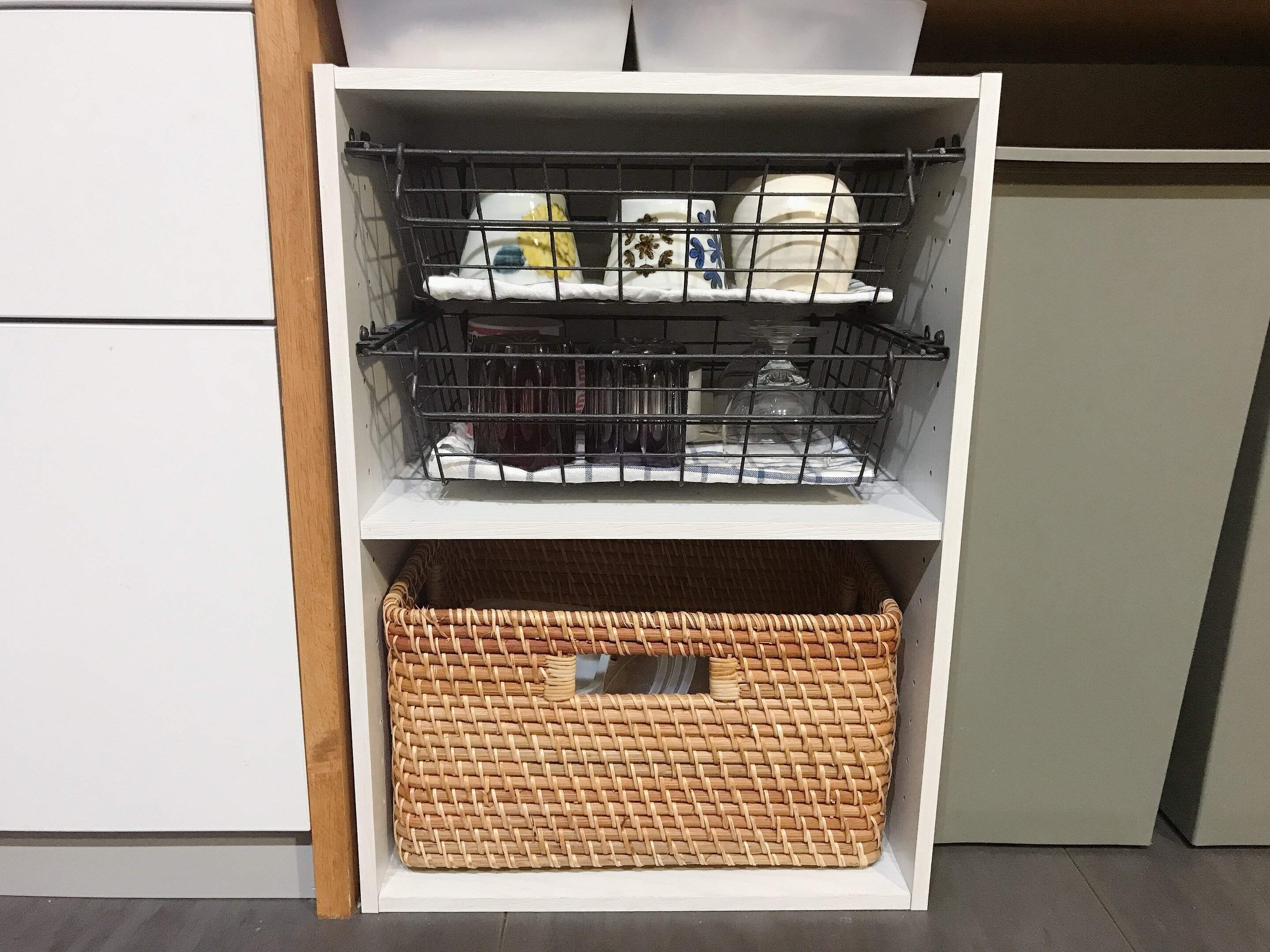 上段のカゴには使用頻度の低い湯呑みや焼酎グラス、小ぶりのワイングラスなどを収納、下段には100均の保存容器を収納しています。