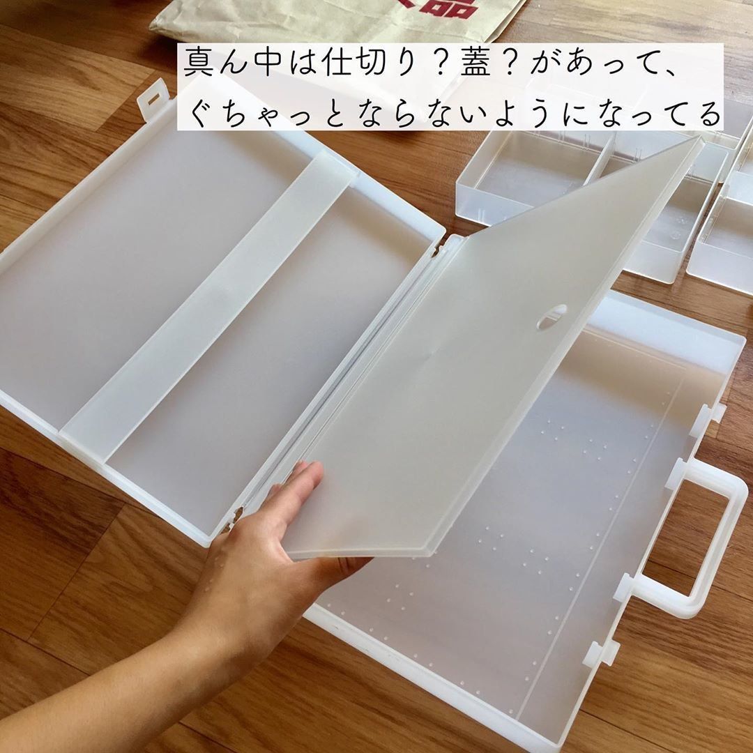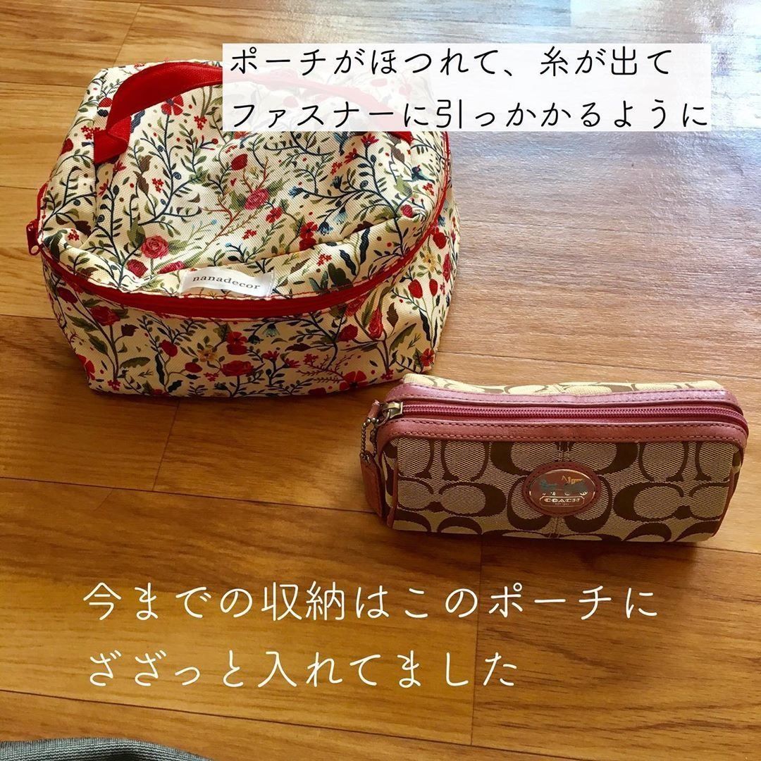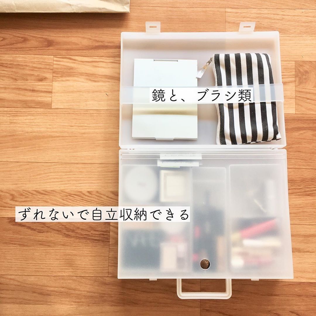 収納ケースの中は、真ん中に仕切りのようなふたがあるので、中でグチャグチャにならずに収納できたのだそう。鏡とブラシ類が入ったポーチは、仕切りのふたの反対側に収納します。しっかりとわかれているので、ずれることなく自立収納することができているようです。